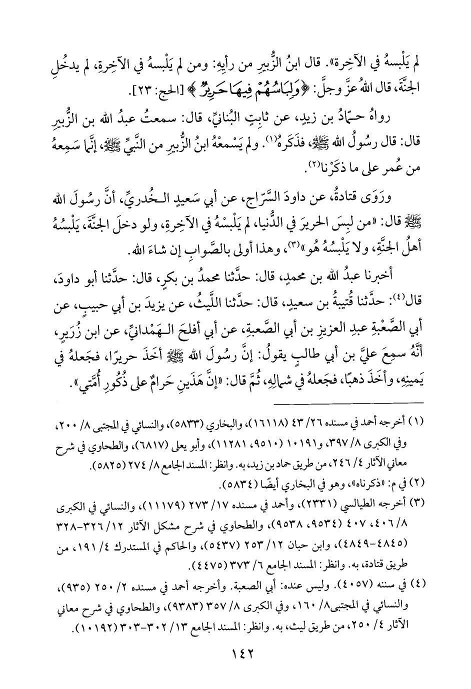 لم يَلْبسهُ في الآخِرة". قال ابنُ الزُّبيرِ من رأيِهِ: ومن لم يَلْبسهُ في الآخِرةِ، لم يدخُلِ الجنَّةَ، قال اللهُ عزَّ وجلَّ: {وَلِبَاسُهُمْ فِيهَا حَرِيرٌ} [الحج: ٢٣].