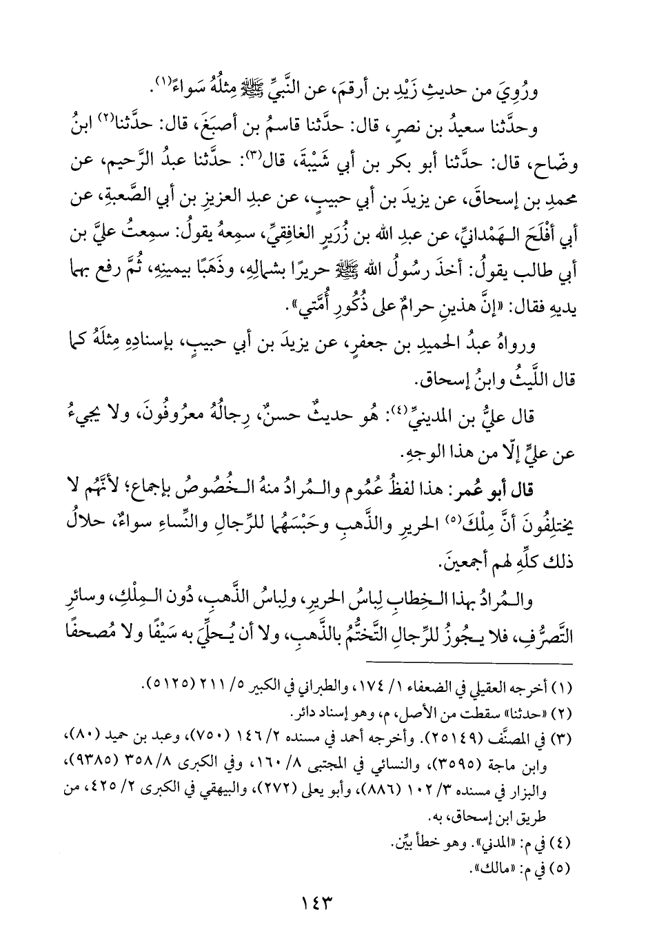 وحدَّثنا سعيدُ بن نصرٍ، قال: حدَّثنا قاسمُ بن أصبَغَ، قال: حدَّثنا (¬٢) ابنُ وضّاح، قال: حدَّثنا أبو بكر بن أبي شَيْبةَ، قال (¬٣): حدَّثنا عبدُ الرَّحيم، عن محمدِ بن إسحاقَ، عن يزيدَ بن أبي حبيبٍ، عن عبدِ العزيزِ بن أبي الصَّعبةِ، عن أبي أفْلَحَ الهَمْدانيِّ، عن عبدِ الله بن زُرَيرٍ الغافِقيِّ، سمِعهُ يقولُ: سمِعتُ عليَّ بن أبي طالب يقولُ: أخذَ رسُولُ الله - صلى الله عليه وسلم - حريرًا بشمالِهِ، وذَهَبًا بيمينِهِ، ثُمَّ رفع بهما يديهِ فقال: "إنَّ هذينِ حرامٌ على ذُكُورِ أُمَّتي".