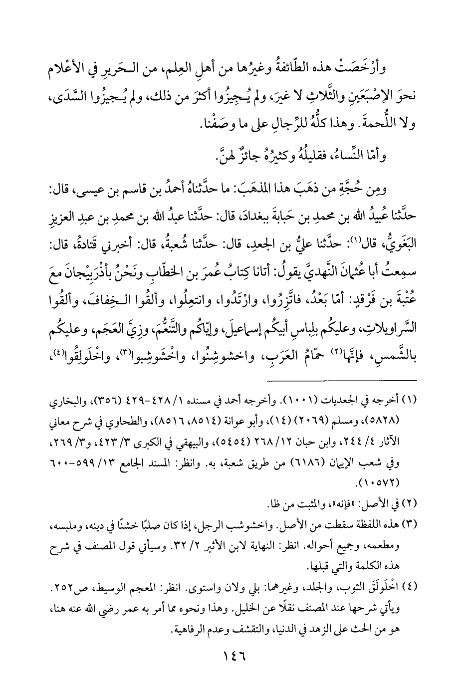 ومن حُجَّةِ من ذهَبَ هذا المذهَبَ: ما حدَّثناهُ أحمدُ بن قاسم بن عيسى، قال: حدَّثنا عُبيدُ الله بن محمدِ بن حَبابةَ ببغدادَ، قال: حدَّثنا عبدُ الله بن محمدِ بن عبدِ العزيزِ البَغَويُّ، قال (¬١): حدَّثنا عليُّ بن الجعدِ، قال: حدَّثنا شُعبةُ، قال: أخبرني قَتادةُ، قال: سمِعتُ أبا عُثمانَ النَّهديَّ يقولُ: أتانا كِتابُ عُمرَ بن الخطّابِ ونَحْنُ بأذْرَبِيْجانَ معَ عُتْبةَ بن فَرْقدٍ: أمّا بَعْدُ، فاتَّزِرُوا، وارْتَدُوا، وانتعِلُوا، وألقُوا الخِفافَ، وألقُوا السَّراويلاتِ، وعليكُم بلِباسِ أبيكُم إسماعيلَ، وإيّاكُم والتَّنعُّمَ، وزِيَّ العَجَم، وعليكُم بالشَّمسِ، فإنَّها (¬٢) حمّامُ العَرَبِ، واخشوشِنُوا، واخْشَوشِبوا (¬٣)، واخْلَولِقُوا (¬٤)،