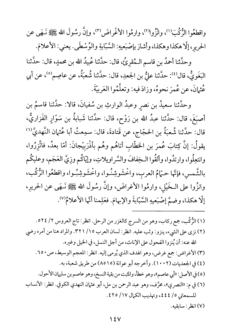 وحدَّثنا سعيدُ بن نصرٍ وعبدُ الوارثِ بن سُفيانَ، قالا: حدَّثنا قاسمُ بن أصبَغَ، قال: حدَّثنا عبدُ الله بن رَوْح، قال: حدَّثنا شَبابةُ بن سَوّارٍ الفَزاريُّ، قال: حدَّثنا شُعبَةُ بن الحجّاج، عن قَتادةَ، قال: سمِعتُ أبا عُثمان النَّهديَّ (¬٦) يقولُ: إنَّ كِتابَ عُمرَ بن الخطّابِ أتاهُم وهُم بأذْرَبِيْجانَ: أمّا بعدُ، فاتَّزِرُوا، وانتعِلُوا، وارتدُوا، وألقُوا الخِفافَ والسَّراويلاتِ، وإيّاكُم وزِيَّ العَجَم، وعليكُم بالشَّمسِ، فإنَّها حمّامُ العربِ، واخْشَوشِنُوا، واخْشَوشِبُوا، واقطعُوا الرُّكُب، وانزُوا على الخَيْلِ، وارمُوا الأغراضَ، وإنَّ رسُولَ الله - صلى الله عليه وسلم - نَهَى عن الحريرِ، إلّا هكذا، وضمَّ إصْبَعيهِ السَّبّابةَ والإبهامَ. فعَلِمنا أنَّها الأعلامُ (¬٧).