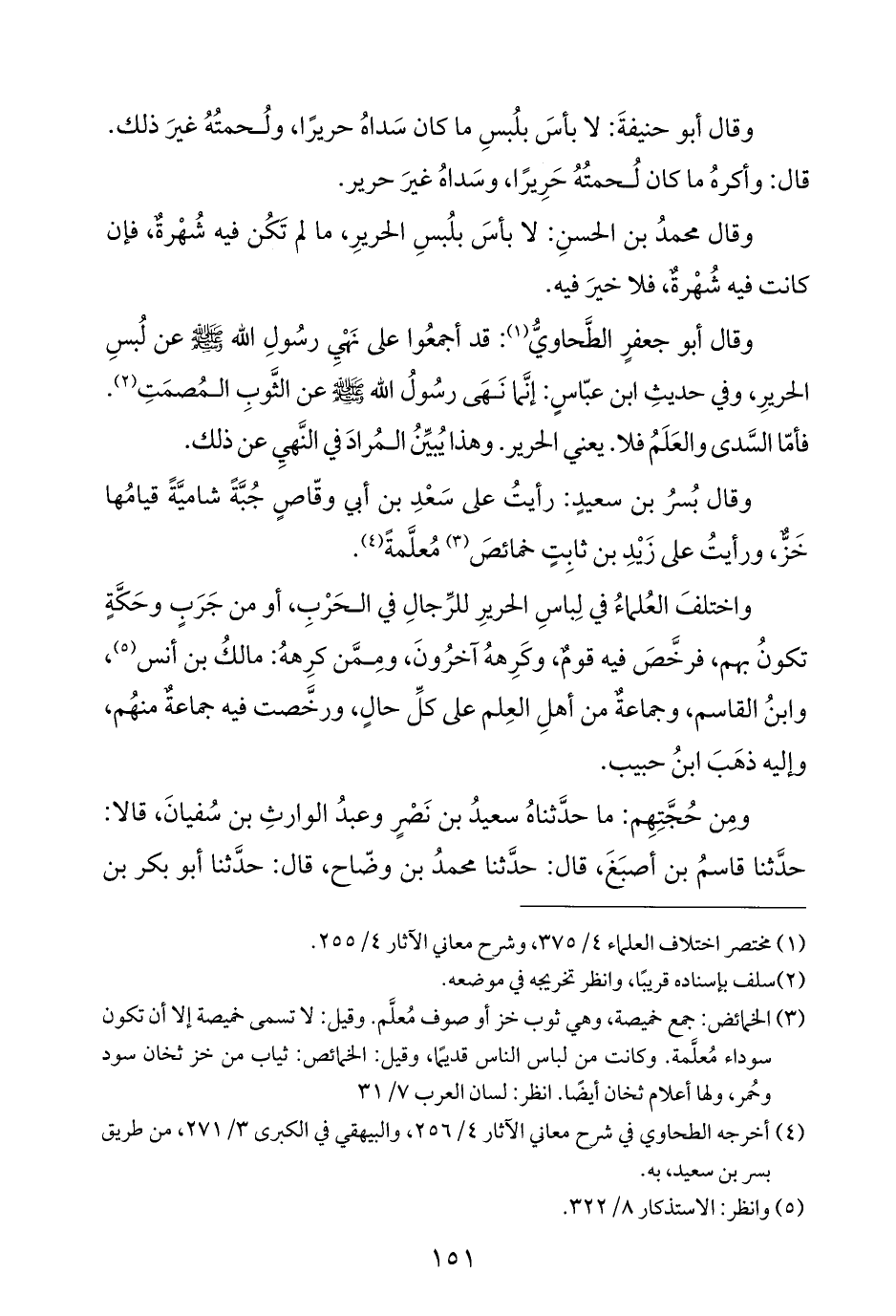 وقال أبو جعفرٍ الطَّحاويُّ (¬١): قد أجمعُوا على نَهْيِ رسُولِ الله - صلى الله عليه وسلم - عن لُبسِ الحريرِ، وفي حديثِ ابن عبّاسٍ: إنَّما نَهَى رسُولُ الله - صلى الله عليه وسلم - عن الثَّوبِ المُصمَتِ (¬٢). فأمّا السَّدى والعَلَمُ فلا. يعني الحرير. وهذا يُبيِّنُ المُرادَ في النَّهيِ عن ذلك.