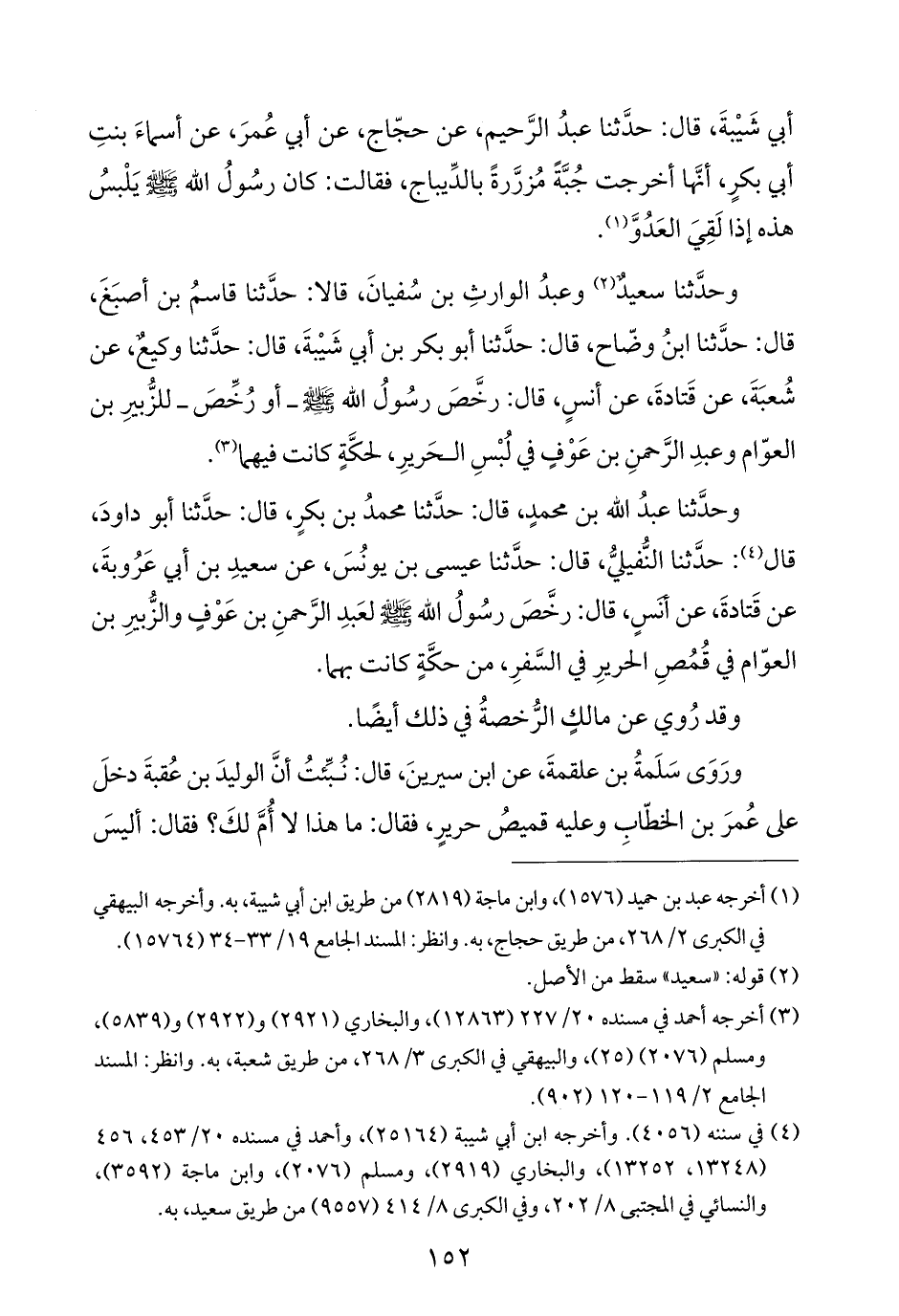 وحدَّثنا عبدُ الله بن محمدٍ، قال: حدَّثنا محمدُ بن بكرٍ، قال: حدَّثنا أبو داودَ، قال (¬٤): حدَّثنا النُّفيليُّ، قال: حدَّثنا عيسى بن يونُسَ، عن سعيدِ بن أبي عَرُوبةَ، عن قَتادةَ، عن أنَسٍ، قال: رخَّصَ رسُولُ الله - صلى الله عليه وسلم - لعَبدِ الرَّحمنِ بن عَوْفٍ والزُّبيرِ بن العوّام في قُمُصِ الحريرِ في السَّفرِ، من حكَّةٍ كانت بهما.