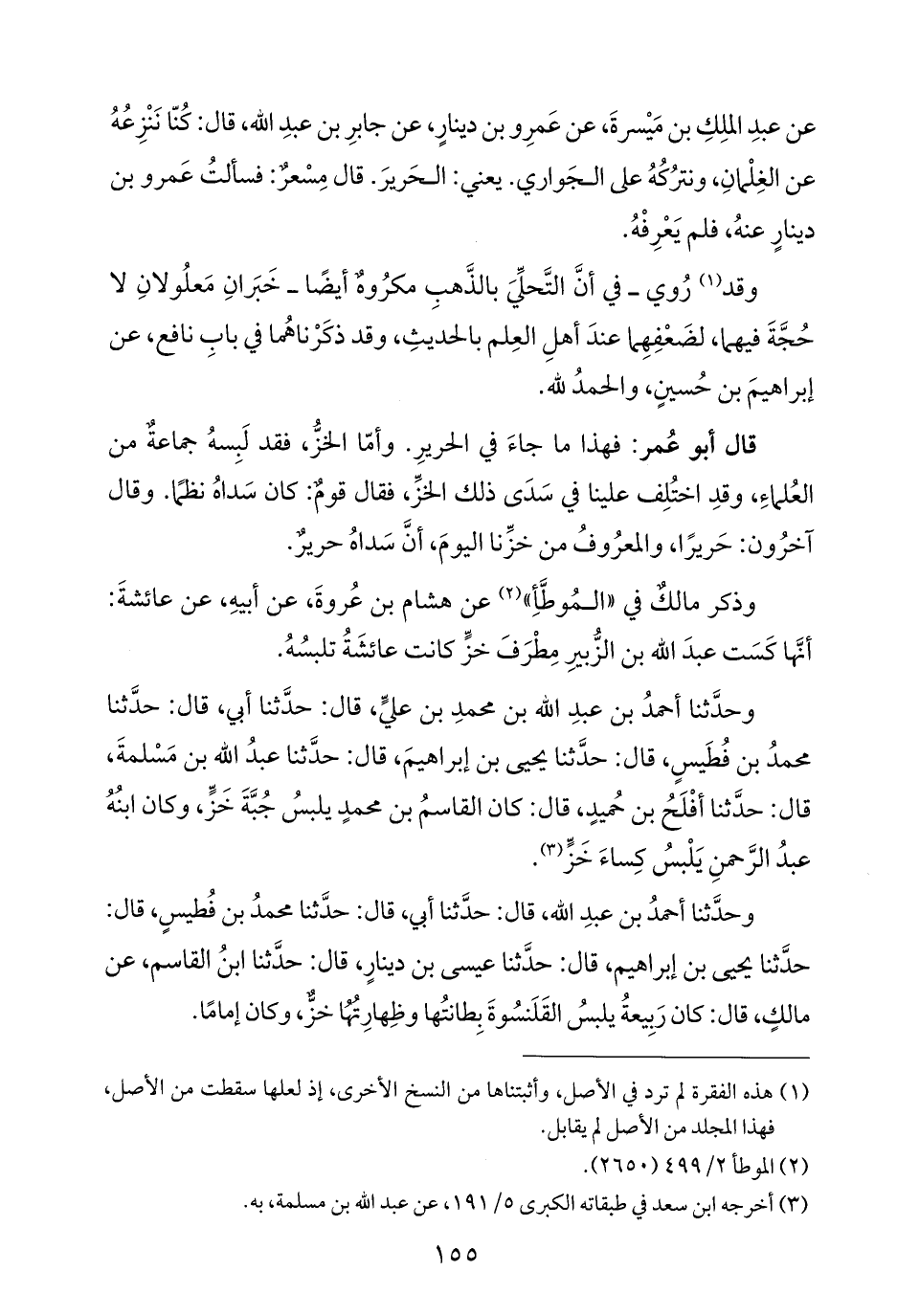 وحدَّثنا أحمدُ بن عبدِ الله بن محمدِ بن عليٍّ، قال: حدَّثنا أبي، قال: حدَّثنا محمدُ بن فُطَيسٍ، قال: حدَّثنا يحيى بن إبراهيمَ، قال: حدَّثنا عبدُ الله بن مَسْلمةَ، قال: حدَّثنا أفْلَحُ بن حُميدٍ، قال: كان القاسمُ بن محمدٍ يلبسُ جُبَّةَ خَزٍّ، وكان ابنُهُ عبدُ الرَّحمنِ يَلْبسُ كِساءَ خَزٍّ (¬٣).