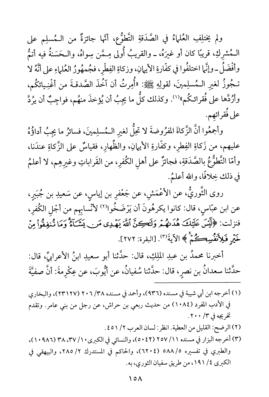 وأجمعُوا أنَّ الزَّكاةَ المفرُوضةَ لا تحِلُّ لغيرِ المُسلِمينَ، فسائرُ ما يجِبُ أداؤُهُ عليهم، من زَكاةِ الفِطرِ، وكفّارةِ الأيمانِ، والظِّهارِ، فقياسٌ على الزَّكاةِ عندَنا، وأمّا التَّطوُّعُ بالصَّدَقةِ، فجائزٌ على أهلِ الكُفرِ، من القَراباتِ وغيرِهِم، لا أعلمُ في ذلك خِلافًا، واللّه أعلمُ.