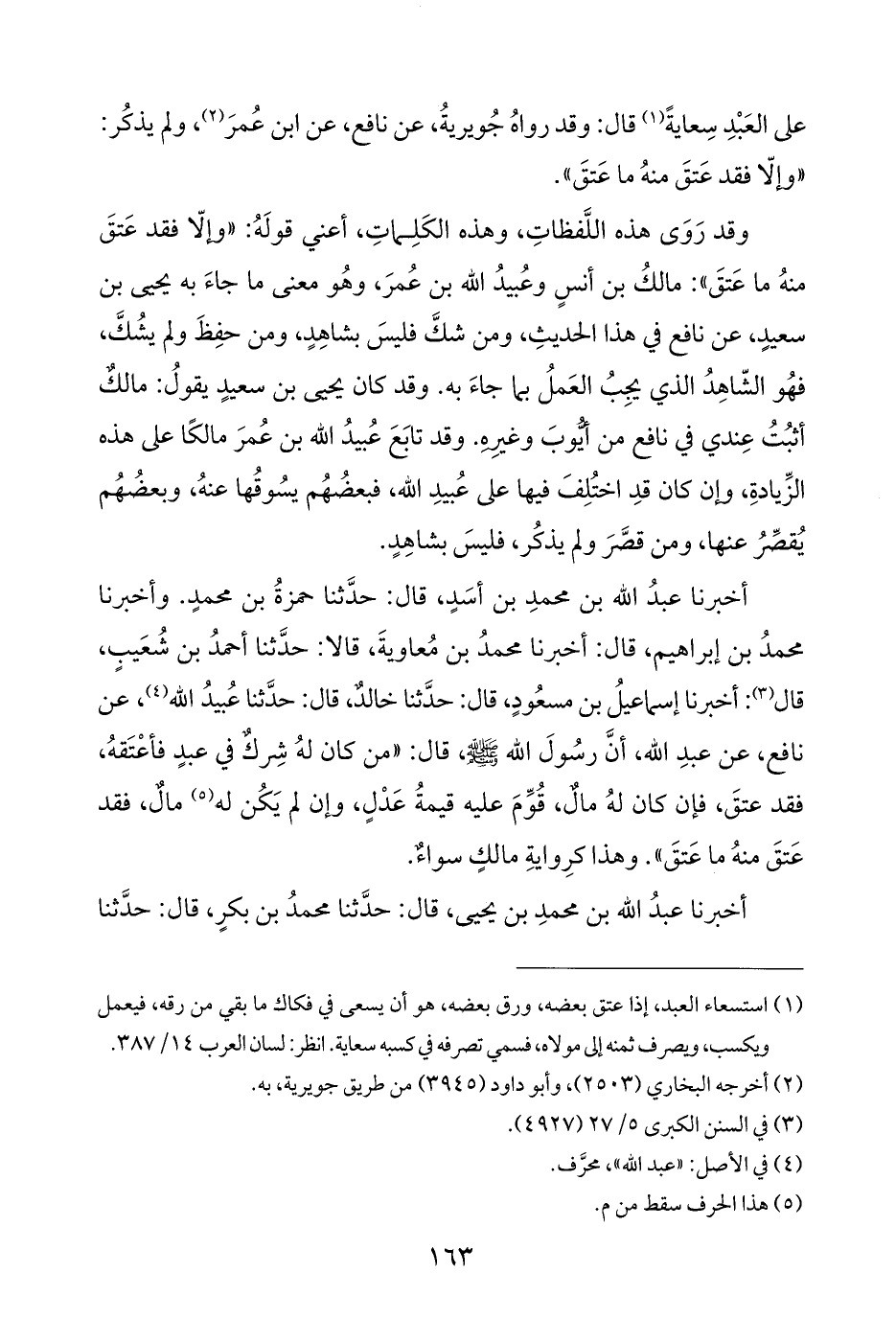وقد رَوَى هذه اللَّفظاتِ، وهذه الكَلِماتِ، أعني قولَهُ: "وإلّا فقد عَتقَ منهُ ما عَتقَ": مالكُ بن أنسٍ وعُبيدُ الله بن عُمرَ، وهُو معنى ما جاءَ به يحيى بن سعيدٍ، عن نافع في هذا الحديثِ، ومن شكَّ فليسَ بشاهِدٍ، ومن حفِظَ ولم يشُكَّ، فهُو الشّاهِدُ الذي يجِبُ العَملُ بما جاءَ به. وقد كان يحيى بن سعيدٍ يقولُ: مالكٌ أثبُتُ عِندي في نافع من أيُّوبَ وغيرِهِ. وقد تابع عُبيدُ الله بن عُمرَ مالكًا على هذه الزِّيادةِ، وإن كان قدِ اختُلِفَ فيها على عُبيدِ الله، فبعضُهُم يسُوقُها عنهُ، وبعضُهُم يُقصِّرُ عنها، ومن قصَّرَ ولم يذكُر، فليسَ بشاهِدٍ.
