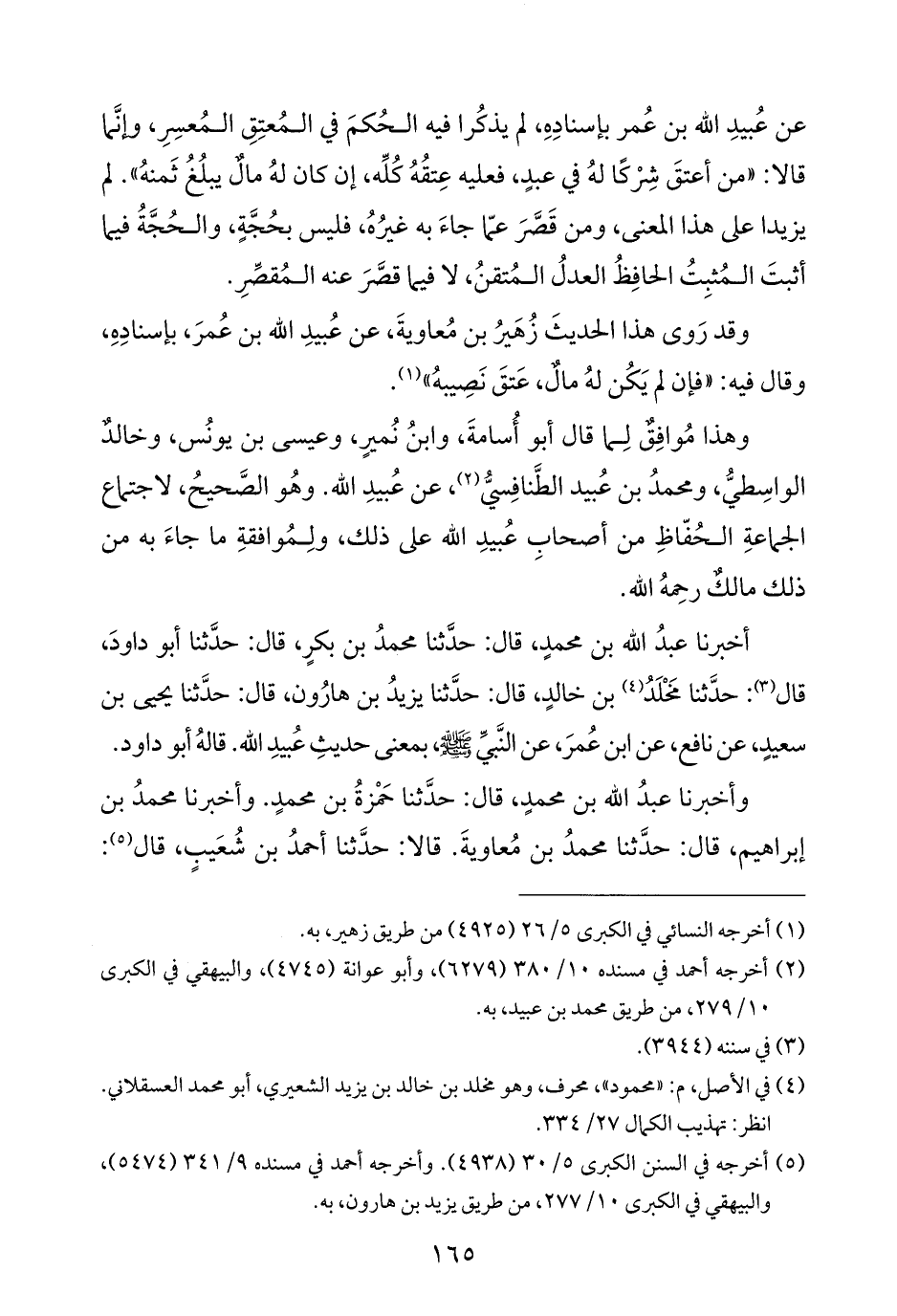 عن عُبيدِ الله بن عُمر بإسناده، لم يذكُرا فيه الحُكمَ في المُعتِقِ المُعسِرِ، وإنَّما قالا: "من أعتقَ شِرْكًا لهُ في عبدٍ، فعليه عِتقُهُ كُلِّه، إن كان لهُ مالٌ يبلُغُ ثَمنهُ". لم يزيدا على هذا المعنى، ومن قَصَّرَ عمّا جاءَ به غيرُهُ، فليس بحُجَّةٍ، والحُجَّةُ فيما أثبتَ المُثبِتُ الحافِظُ العدلُ المُتقنُ، لا فيما قصَّرَ عنه المُقصِّرِ.