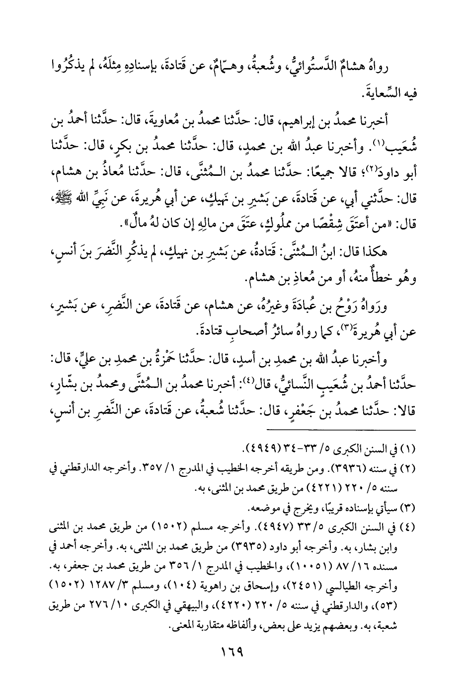 رواهُ هشامٌ الدَّستُوائيُّ، وشُعبةُ، وهمّامٌ، عن قَتادةَ، بإسنادِهِ مِثلَهُ، لم يذكُرُوا فيه السِّعايةَ.