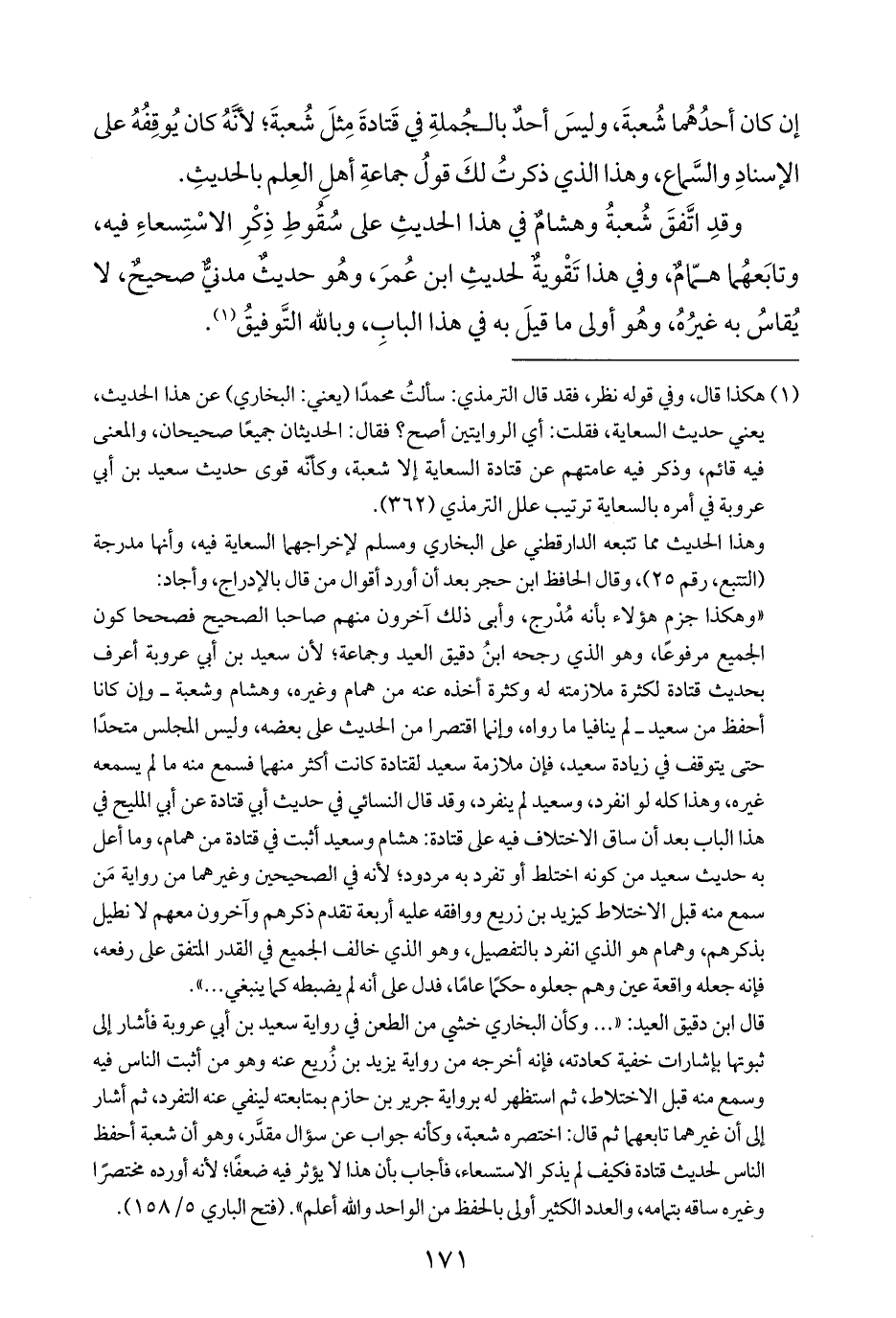 "وهكذا جزم هؤلاء بأنه مُدْرج، وأبي ذلك آخرون منهم صاحبا الصحيح فصححا كون الجميع مرفوعًا، وهو الذي رجحه ابنُ دقيق العيد وجماعة؛ لأن سعيد بن أبي عروبة أعرف بحديث قتادة لكثرة ملازمته له وكثرة أخذه عنه من همام وغيره، وهشام وشعبة - وإن كانا أحفظ من سعيد - لم ينافيا ما رواه، وإنما اقتصرا من الحديث على بعضه، وليس المجلس متحدًا حتى يتوقف في زيادة سعيد، فإن ملازمة سعيد لقتادة كانت أكثر منهما فسمع منه ما لم يسمعه غيره، وهذا كله لو انفرد، وسعيد لم ينفرد، وقد قال النسائي في حديث أبي قتادة عن أبي المليح في هذا الباب بعد أن ساق الاختلاف فيه على قتادة: هشام وسعيد أثبت في قتادة من همام، وما أعل به حديث سعيد من كونه اختلط أو تفرد به مردود؛ لأنه في الصحيحين وغيرهما من رواية مَن سمع منه قبل الاختلاط كيزيد بن زريع ووافقه عليه أربعة تقدم ذكرهم وآخرون معهم لا نطيل بذكرهم، وهمام هو الذي انفرد بالتفصيل، وهو الذي خالف الجميع في القدر المتفق على رفعه، فإنه جعله واقعة عين وهم جعلوه حكمًا عامًّا، فدل على أنه لم يضبطه كما ينبغي ... ".
