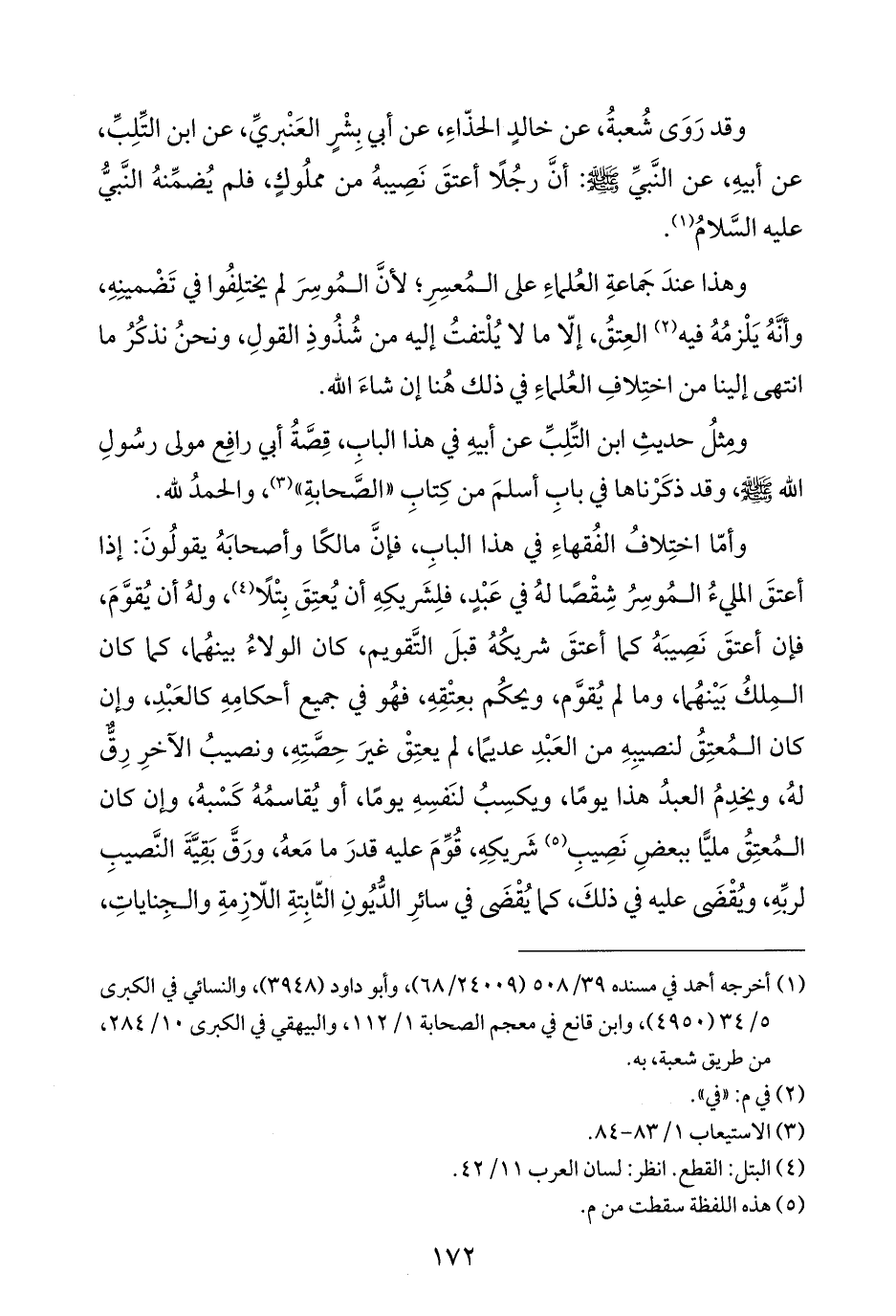 وقد رَوَى شُعبةُ، عن خالدٍ الحذّاءِ، عن أبي بِشْرٍ العَنْبريِّ، عن ابن التِّلِبِّ، عن أبيهِ، عن النَّبيِّ - صلى الله عليه وسلم -: أنَّ رجُلًا أعتقَ نَصِيبهُ من مملُوكٍ، فلم يُضمِّنهُ النَّبيُّ عليه السَّلامُ (¬١).