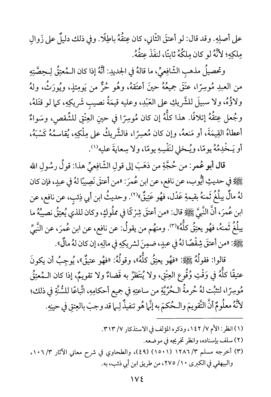 قال أبو عُمر: من حُجَّةِ من ذهَبَ إلى قولِ الشّافِعيِّ هذا: قولُ رسُولِ الله - صلى الله عليه وسلم - في حديثِ أيُّوب، عن نافع، عن ابن عُمرَ: "من أعتقَ نَصِيبًا لهُ في عبدٍ، فإن كان لهُ مالٌ يبلُغُ ثَمنهُ بقيمةِ عَدْل، فهُو عَتِيقٌ" (¬٢). وحديثُ ابن أبي ذِئبٍ، عن نافع، عن ابن عُمرَ، أنَّ النَّبيَّ - صلى الله عليه وسلم - قال: "من أعتقَ شِرْكًا في مملُوكٍ، وكان للذي يُعتِقُ نصيبُهُ ما يبلُغُ ثَمنهُ، فهُو يعتِقُ كلُّهُ" (¬٣). ومنهُم من يقولُ: عن نافع، عن ابن عُمرَ، عن النَّبيِّ - صلى الله عليه وسلم -: "من أعتقَ شِقْصًا لهُ في عبدٍ، ضمِنَ لشريكِهِ في مالِهِ، إن كان لهُ مالٌ".