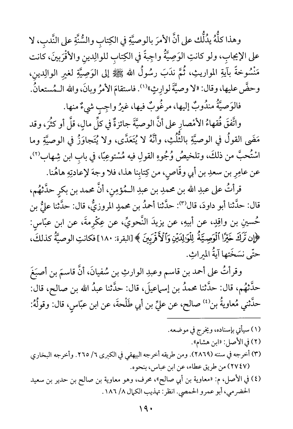 وهذا كلُّهُ يدُلُّك على أنَّ الأمرَ بالوصيَّةِ في الكِتابِ والسُّنَّةِ على النَّدبِ، لا على الإيجاب، ولو كانتِ الوَصِيَّةُ واجِبةً في الكِتابِ للوالِدينِ والأقْرَبينَ، كانت مَنْسُوخةً بآيةِ المواريثِ، ثُمَّ ندَبَ رسُولُ الله إلى الوَصِيَّةِ لغيرِ الوالِدينِ، وحضَّ عليها، وقال: "لا وصيَّةَ لوارِثٍ" (¬١). فاستقامَ الأمرُ وبانَ، واللّه المُستعانُ.