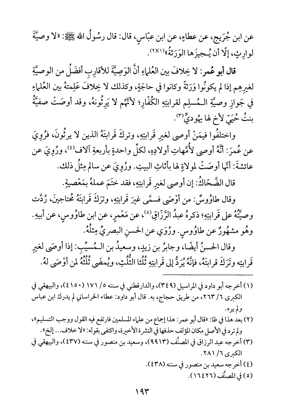 قال أبو عُمر: لا خِلافَ بين العُلماءِ أنَّ الوَصِيَّةَ للأقارِبِ أفضَلُ من الوصيَّةِ لغيرِهِم إذا لم يكونُوا وَرَثةً وكانوا في حاجَةٍ، وكذلك لا خِلافَ عَلِمتهُ بين العُلماءِ في جَوازِ وصيَّةِ المُسلِم لقرابتِهِ الكُفّارِ؛ لأنَّهُم لا يَرِثُونهُ، وقد أوصَتْ صفيَّةُ بنتُ حُيَيّ لأخ لها يهُوديٍّ (¬٣).
