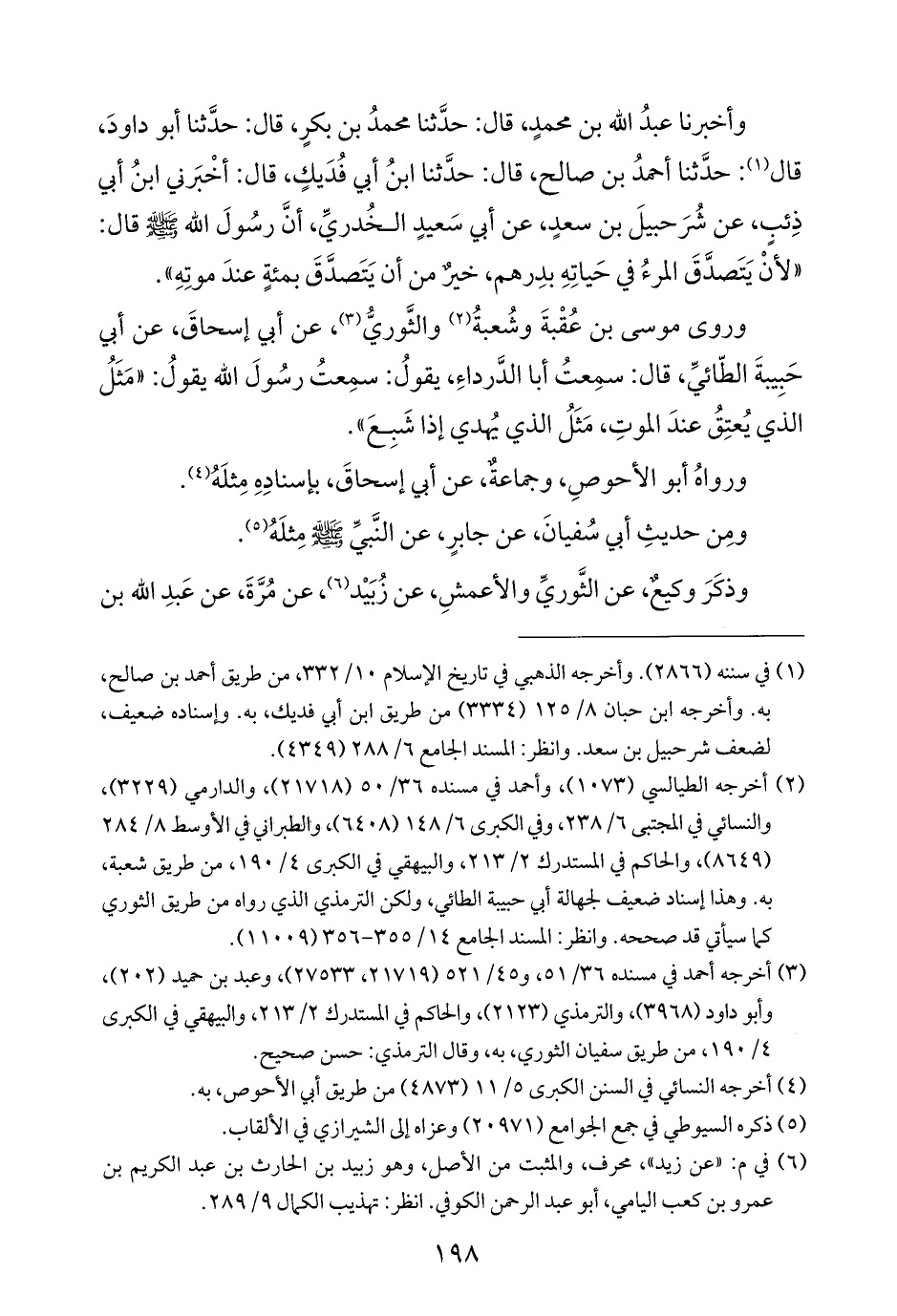 وروى موسى بن عُقْبةَ وشُعبةُ (¬٢) والثَّوريُّ (¬٣)، عن أبي إسحاقَ، عن أبي حَبِيبةَ الطّائيِّ، قال: سمِعتُ أبا الدَّرداءِ، يقولُ: سمِعتُ رسُولَ الله يقولُ: "مَثَلُ الذي يُعتِقُ عندَ الموتِ، مَثَلُ الذي يُهدي إذا شَبِعَ".