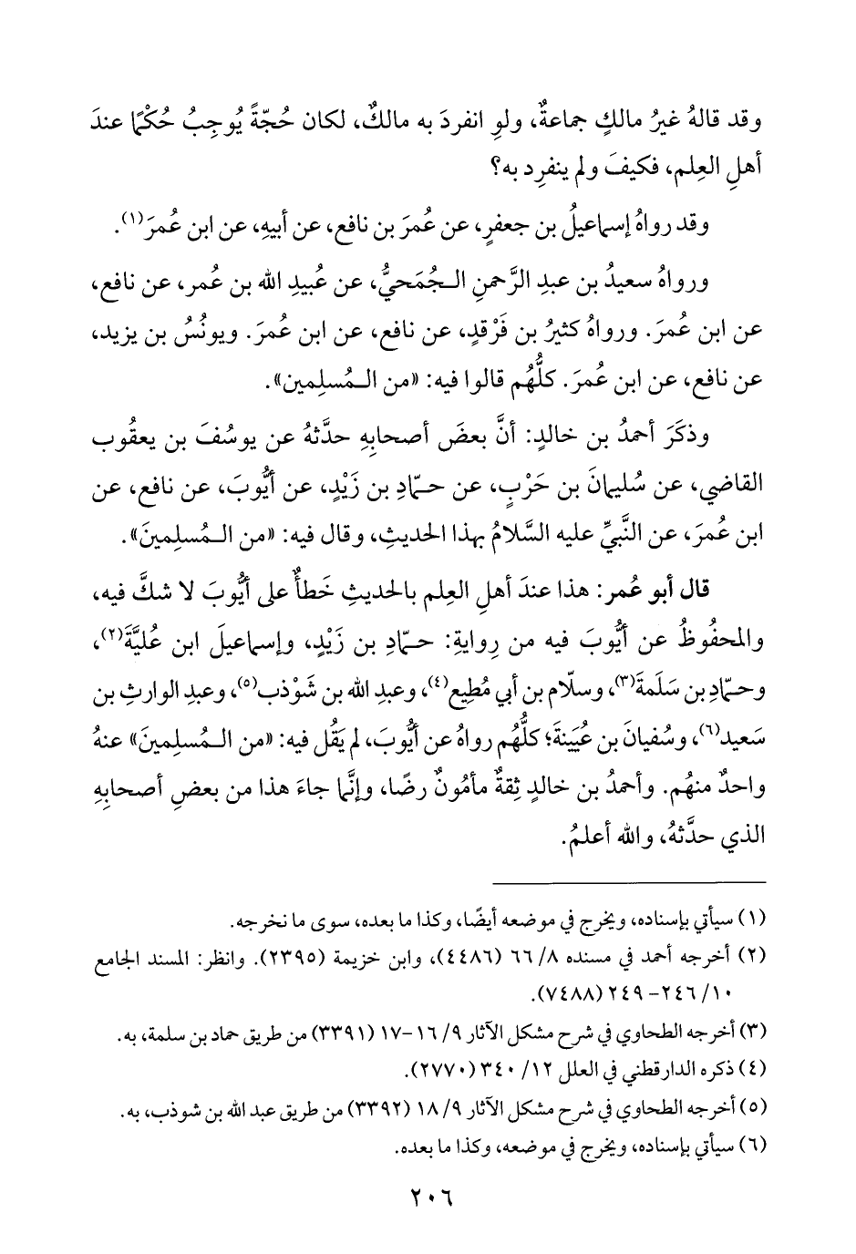 قال أبو عُمر: هذا عندَ أهلِ العِلم بالحديثِ خَطأٌ على أيُّوبَ لا شكَّ فيه، والمحفُوظُ عن أيُّوبَ فيه من رِوايةِ: حمّادِ بن زَيْدٍ، وإسماعيلَ ابن عُليَّةَ (¬٢)، وحمّادِ بن سَلَمةَ (¬٣)، وسلّام بن أبي مُطِيع (¬٤)، وعبدِ الله بن شَوْذب (¬٥)، وعبدِ الوارثِ بن سَعيد (¬٦)، وسُفيانَ بن عُيَينةَ؛ كلُّهُم رواهُ عن أيُّوبَ، لم يَقُل فيه: "من المُسلِمينَ" عنهُ واحدٌ منهُم. وأحمدُ بن خالدٍ ثِقةٌ مأمُونٌ رضًا، وإنَّما جاءَ هذا من بعضِ أصحابِهِ الذي حدَّثهُ، واللّه أعلمُ.