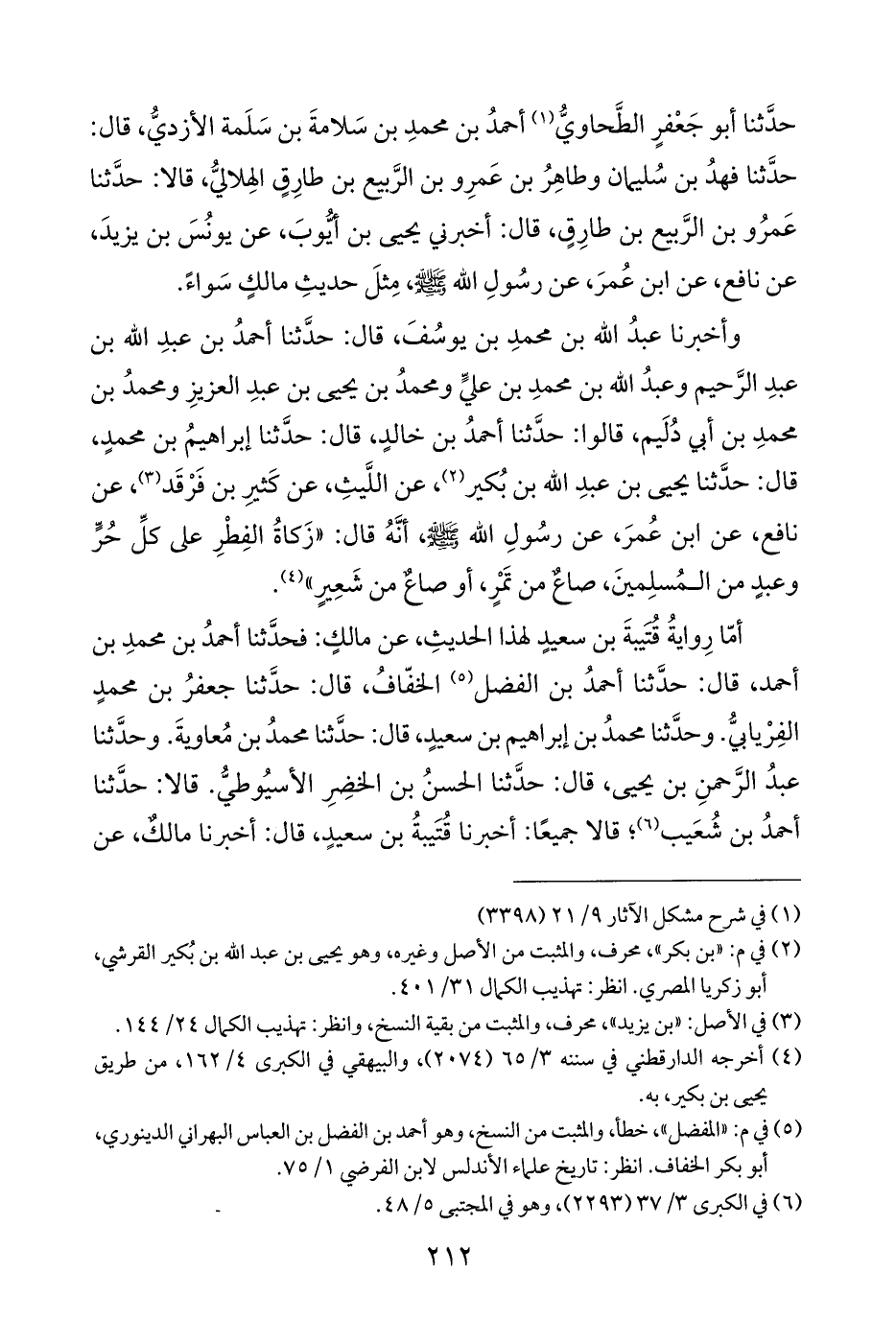 حدَّثنا أبو جَعْفرٍ الطَّحاويُّ (¬١) أحمدُ بن محمدِ بن سَلامةَ بن سَلَمة الأزديُّ، قال: حدَّثنا فهدُ بن سُليمان وطاهِرُ بن عَمرِو بن الرَّبيع بن طارِقٍ الِهلاليُّ، قالا: حدَّثنا عَمرُو بن الرَّبيع بن طارِقٍ، قال: أخبرني يحيى بن أيُّوبَ، عن يوُنسَ بن يزيدَ، عن نافع، عن ابن عُمرَ، عن رسُولِ الله - صلى الله عليه وسلم -، مِثلَ حديثِ مالكٍ سَواءً.