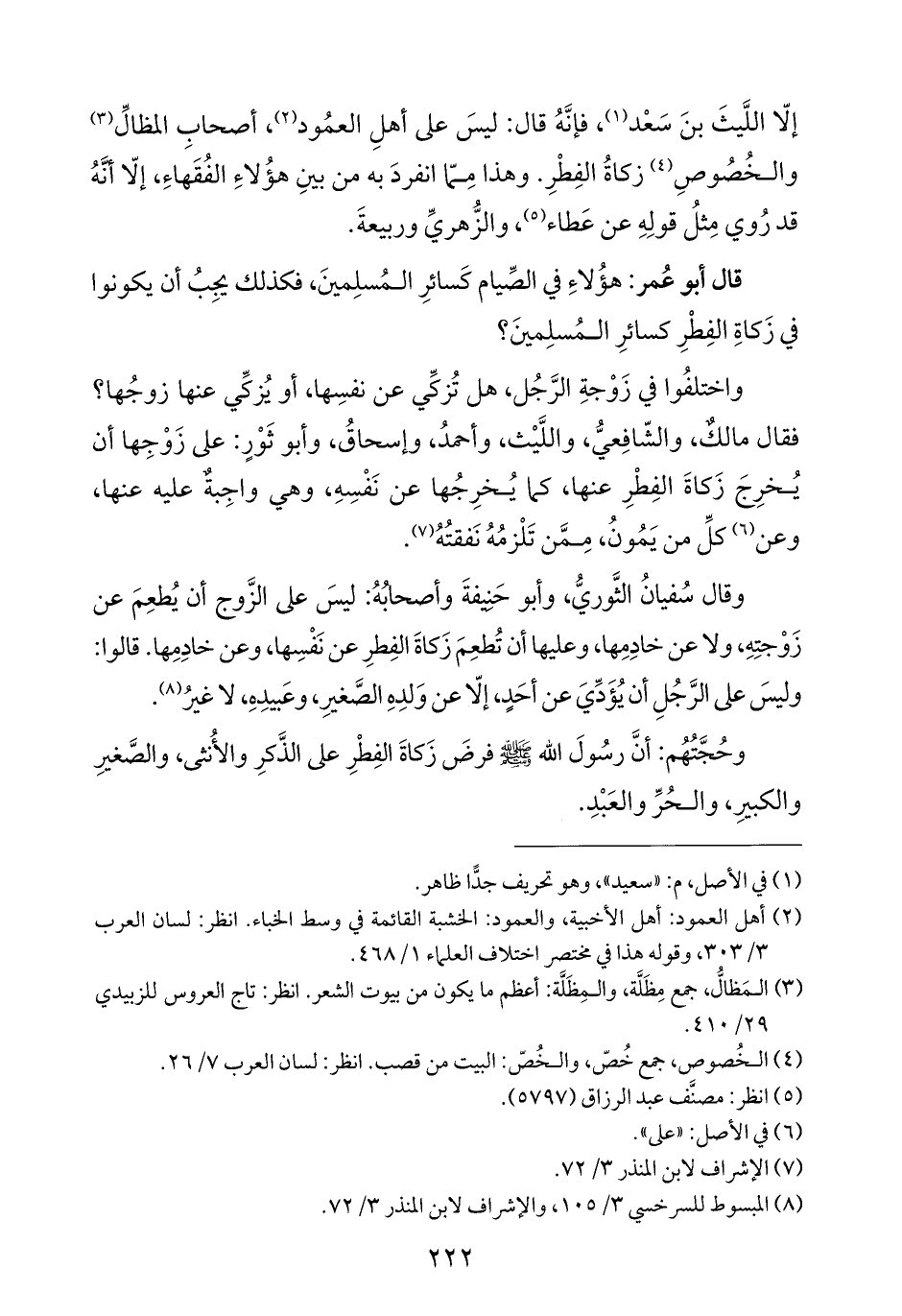 إلّا اللَّيثَ بنَ سَعْد (¬١)، فإنَّهُ قال: ليسَ على أهلِ العمُود (¬٢)، أصحابِ المظالِّ (¬٣) والخُصُوصِ (¬٤) زكاةُ الفِطْرِ. وهذا مِمّا انفردَ به من بينِ هؤُلاءِ الفُقَهاءِ، إلّا أنَّهُ قد رُوي مِثلُ قولِهِ عن عَطاء (¬٥)، والزُّهريِّ وربيعةَ.