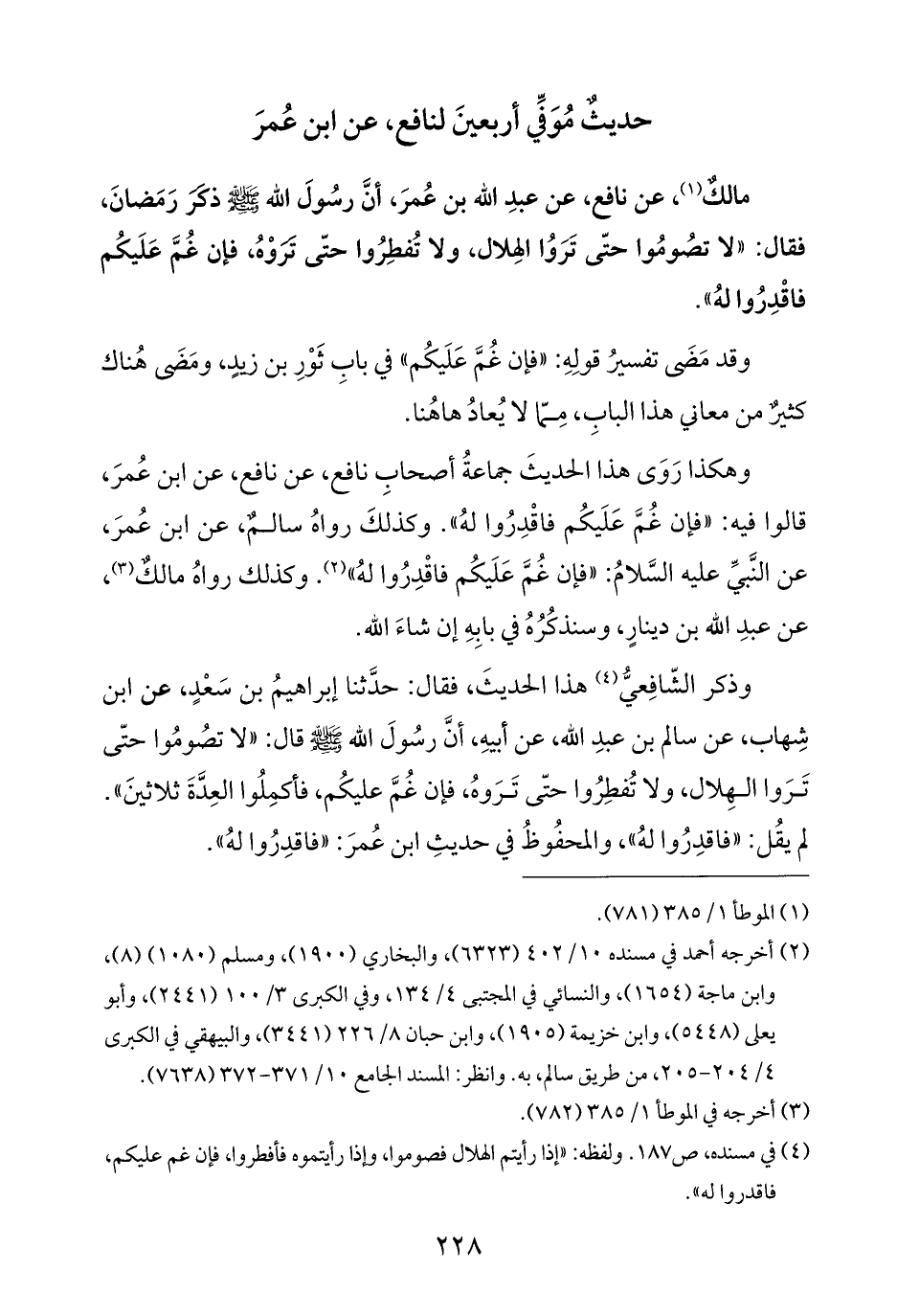 مالكٌ (¬١)، عن نافع، عن عبدِ الله بن عُمرَ، أنَّ رسُولَ الله - صلى الله عليه وسلم - ذكَرَ رَمَضانَ، فقال: "لا تصُومُوا حتَّى تَرَوُا الهِلال، ولا تُفطِرُوا حتَّى ترَوْهُ، فإن غُمَّ عَلَيكُم فاقْدِرُوا لهُ".