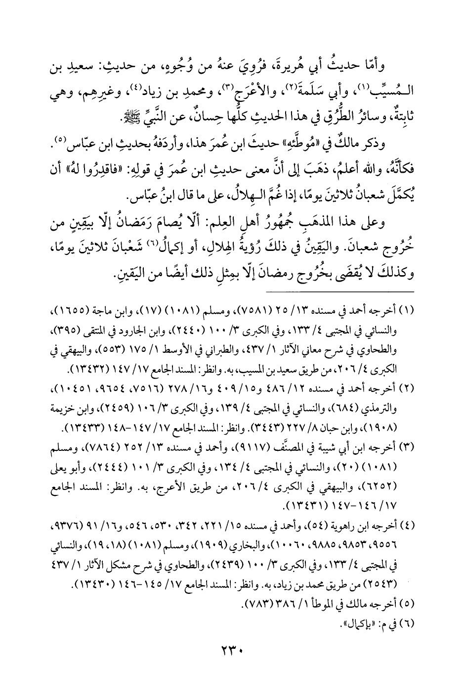 وعلى هذا المذهَبِ جُمهُورُ أهلِ العِلم: ألّا يُصامَ رَمَضانُ إلّا بيّقِينٍ من خُرُوج شعبانَ. واليَقِينُ في ذلكَ رُؤيةُ الهِلالِ، أو إكمالُ (¬٦) شَعْبانَ ثلاثينَ يومًا، وكذلكَ لا يُقضَى بخُرُوج رمضانَ إلّا بمِثلِ ذلك أيضًا من اليَقينِ.