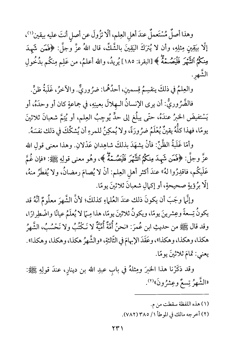 وإنَّما وجَبَ أن يكونَ ذلك عندَ العُلماءِ كذلكَ؛ لأنَّ الشَّهرَ معلُومٌ أنَّهُ قد يكونُ تِسعةً وعِشرينَ يومًا، ويكونُ ثلاثينَ يومًا، هذا مِمّا لا يُعلَمُ عيانًا واضْطِرارًا، وقد قال - صلى الله عليه وسلم - من حديثِ ابن عُمرَ: "نحنُ أُمَّة أُمِّيَّةٌ لا نَكْتُبُ ولا نَحْسُبُ، الشَّهرُ هكذا، وهكذا، وهكذا"، وعَقَدَ الإبهامَ في الثّالثةِ، "والشَّهرُ هكذا، وهكذا، وهكذا". يعني: تمامَ ثلاثينَ يومًا.