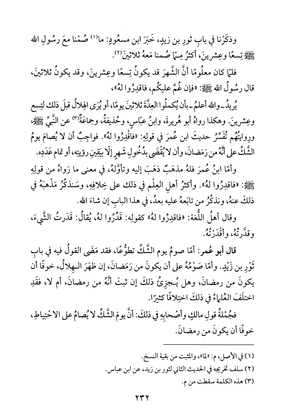 يُريدُ - واللّه أعلمُ - بأن يُكملُوا العِد ثلاثينَ يومًا، أو يُرَى الهِلالُ قبلَ ذلك لتِسع وعِشرينَ. وهكذا رواهُ أبو هُريرةَ، وابنُ عبّاسٍ، وحُذيفةُ، وجماعَةٌ (¬٣) عن النَّبيِّ - صلى الله عليه وسلم -، ورِوايتُهُم تُفَسِّرُ حديثَ ابن عُمرَ في قولِهِ: "فاقْدِرُوا لهُ". فواجِبٌ أن لا يُصامَ يومُ الشَّكِّ على أَنَّهُ من رَمَضانَ، وأن لا يُقْضَى بدُخُولِ شَهرٍ إلّا بيَقِينِ رؤيتِهِ، أو تمام عَدَدِهِ.