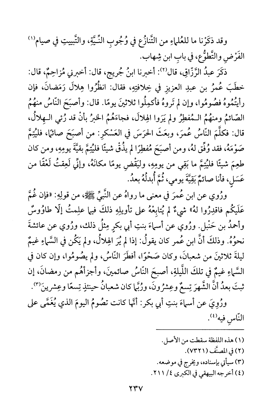 ذكَرَ عبدُ الرَّزّاقِ، قال (¬٢): أخبرنا ابنُ جُريج، قال: أخبرني مُزاحِمٌ، قال: خطَبَ عُمرُ بن عبدِ العزيزِ في خِلافتِهِ، فقال: انظُرُوا هِلالَ رَمَضانَ، فإن رأيتُمُوهُ فصُومُوا، وإن لم تَروهُ فأكمِلُوا ثلاثينَ يومًا. قال: وأصبَحَ النّاسُ منهُمُ الصّائمُ ومنهُمُ المُفطِرُ ولم يَرَوا الهِلالَ، فجاءَهُمُ الخبرُ بأنْ قد رُئي الهِلالُ، قال: فكلَّمَ النّاسُ عُمرَ، وبعَثَ الحرَسَ في العَسْكرِ: من أصبَحَ صائمًا، فليُتِمَّ صَوْمَهُ، فقد وُفِّق لهُ، ومن أصبَحَ مُفطِرًا لم يذُقْ شيئًا فليُتِمَّ بقيَّةَ يومِهِ، ومن كان طعِمَ شيئًا فليُتِمَّ ما بَقِي من يومِهِ، وليَقْضِ يومًا مكانَهُ، وإنِّي لَعِقتُ لَعْقًا من عَسَلٍ، فأنا صائمٌ بَقِيَّةَ يومي، ثُمَّ أُبدلُهُ بعدُ.