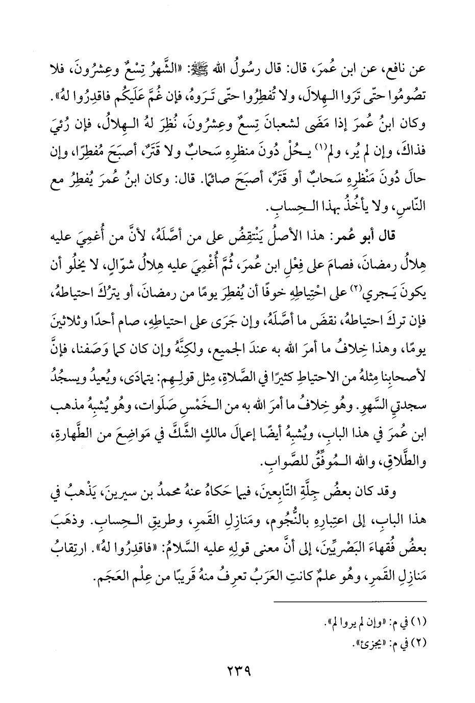 وقد كان بعضُ جِلَّةِ التّابِعينَ، فيما حَكاهُ عنهُ محمدُ بن سيرينَ، يَذْهبُ في هذا البابِ، إلى اعتِبارِهِ بالنُّجُوم، ومَنازِلِ القَمرِ، وطريقِ الحِسابِ. وذهَبَ بعضُ فُقهاءَ البَصْريِّينَ، إلى أنَّ معنى قولِهِ عليه السَّلامُ: "فاقدِرُوا لهُ". ارتِقابُ مَنازِلِ القَمرِ، وهُو علمٌ كانتِ العَرَبُ تعرِفُ منهُ قَريبًا من عِلْم العَجَم.