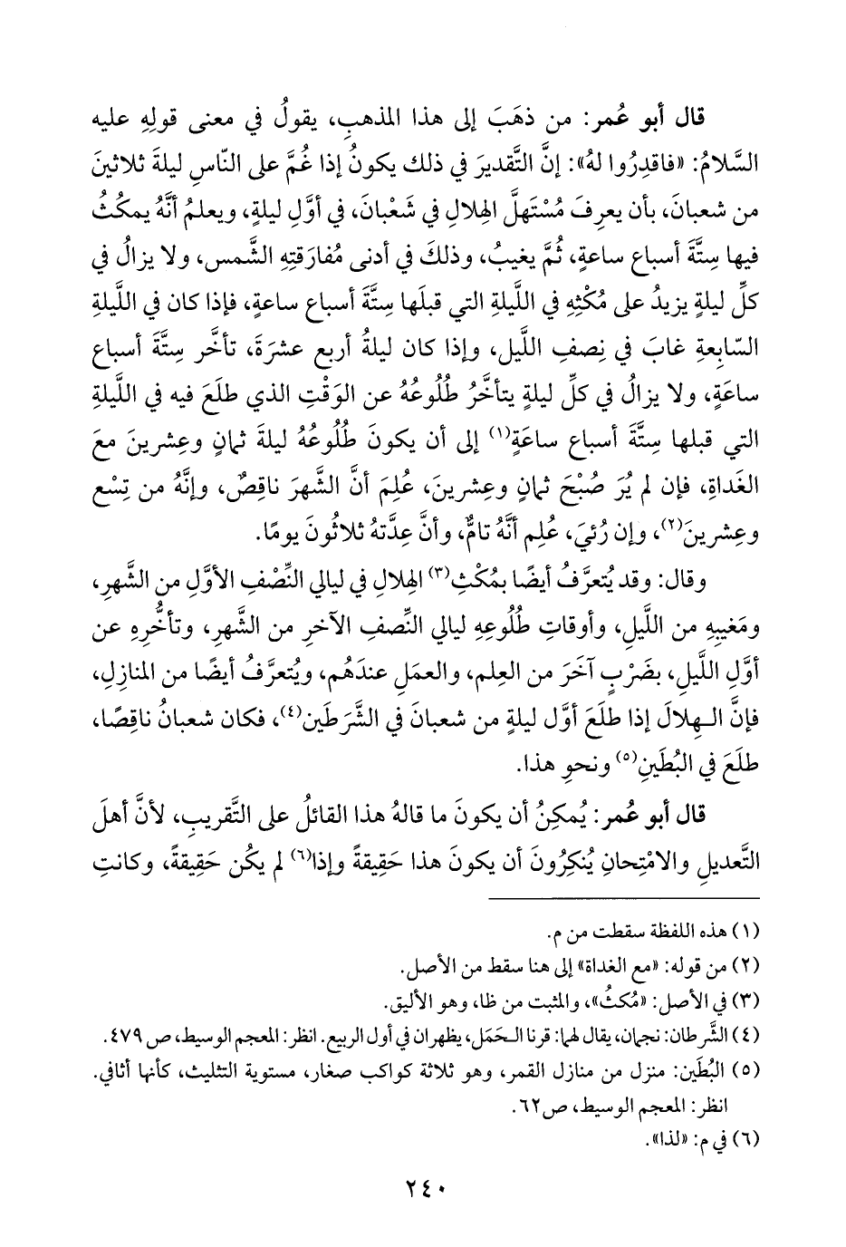 وقال: وقد يُتعرَّفُ أيضًا بمُكْثِ (¬٣) الهِلالِ في ليالي النِّصْفِ الأوَّلِ من الشَّهرِ، ومَغيبِهِ من اللَّيلِ، وأوقاتِ طُلُوعِهِ ليالي النِّصفِ الآخرِ من الشَّهرِ، وتأخُّرِهِ عن أوَّلِ اللَّيلِ، بضَرْبٍ آخَرَ من العِلم، والعمَلِ عندَهُم، ويُتعرَّفُ أيضًا من المنازِلِ، فإنَّ الهِلالَ إذا طَلَعَ أوَّل ليلةٍ من شعبانَ في الشَّرَطَين (¬٤)، فكان شعبانُ ناقِصًا، طلَعَ في البُطَينِ (¬٥) ونحوِ هذا.