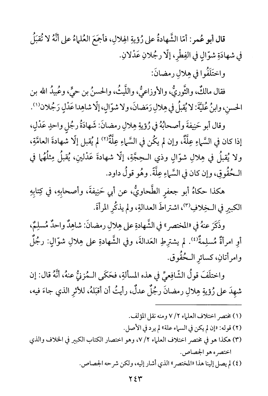 فقال مالكٌ، والثَّوريُّ، والأوزاعيُّ، واللَّيثُ، والحسنُ بن حيٍّ، وعُبيدُ اللّه بن الحسنِ، وابنُ عُليَّةَ: لا يقبلُ في هِلالِ رَمَضانَ، ولا شوّالٍ، إلّا شاهِدا عَدْلٍ رَجُلان (¬١).