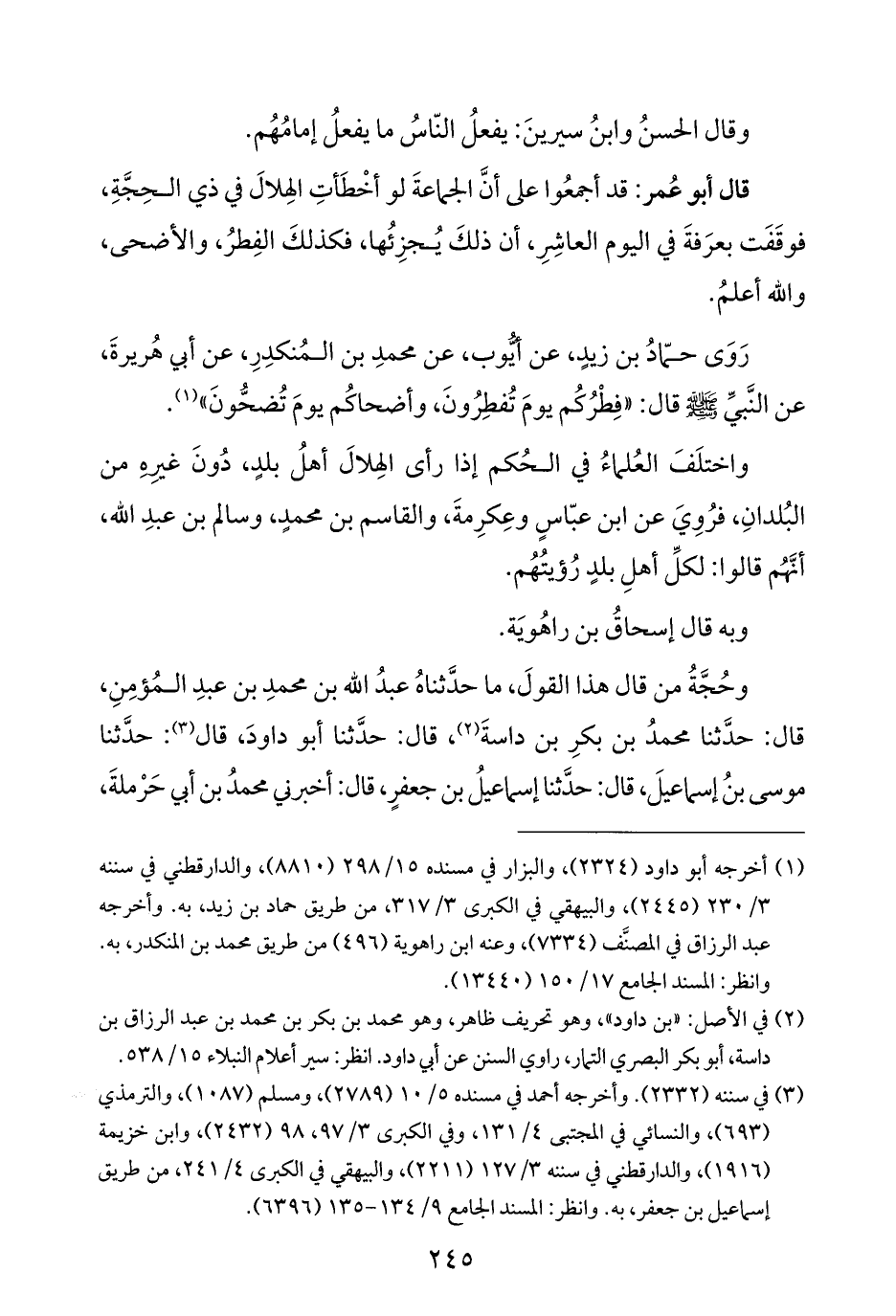 رَوَى حمّادُ بن زيدٍ، عن أيُّوب، عن محمدِ بن المُنكدِرِ، عن أبي هُريرةَ، عن النَّبيِّ -صلى الله عليه وسلم- قال: "فِطْرُكُم يومَ تُفطِرُونَ، وأضحاكُم يومَ تُضحُّونَ" (¬١).
