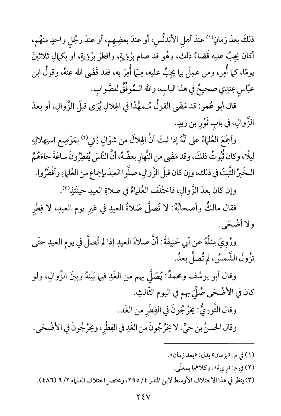 فقال مالكٌ وأصحابُهُ: لا تُصلَّى صَلاةُ العيدِ في غيرِ يوم العيدِ، لا فِطْرٍ ولا أضْحَى.