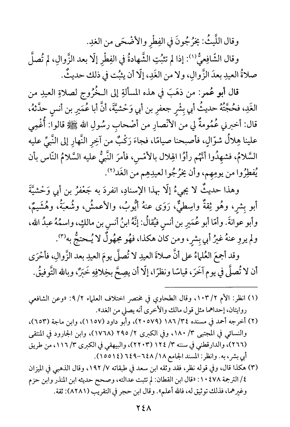 قال أبو عُمر: من ذهَبَ في هذه المسألةِ إلى الخُرُوج لصلاةِ العيدِ من الغَدِ، فحُجَّتُهُ حديثُ أبي بِشْرٍ جعفرِ بن أبي وَحْشيَّةَ، أنَّ أبا عُمَيرِ بن أنسٍ حدَّثهُ، قال: أخبرني عُمُومةٌ لي من الأنْصارِ من أصْحاب رسُولِ اللّه -صلى الله عليه وسلم- قالوا: أُغْمِي علينا هِلالُ شوّالٍ، فأصبحنا صيامًا، فجاءَ رَكْبٌ من آخِرِ النَّهارِ إلى النَّبيِّ عليه السَّلامُ، فشهِدُوا أنَّهُم رأوُا الهِلال بالأمْسِ، فأمرَ النَّبيُّ عليه السَّلامُ النّاس بأن يُفطِرُوا من يومِهِم، وأن يخرُجُوا لعيدِهِم من الغَد (¬٢).