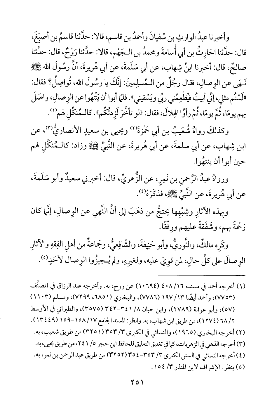 وأخبرنا عبدُ الوارثِ بن سُفيانَ وأحمدُ بن قاسم، قالا: حدَّثنا قاسمُ بن أصبَغَ، قال: حدَّثنا الحارِثُ بن أبي أُسامةَ ومحمدُ بن الجَهْم، قالا: حدَّثنا رَوْحٌ، قال: حدَّثنا صالحٌ، قال: أخبرنا ابنُ شِهاب، عن أبي سَلَمةَ، عن أبي هُريرةَ، أنَّ رسولَ اللّه -صلى الله عليه وسلم- نَهَى عن الوِصالِ، فقال رجُلٌ من المُسلِمينَ: إنَّكَ يا رسُولَ اللّه، تُواصِلُ؟ فقال: "لَسْتُم مثلي، إنِّي أبيتُ فيُطْعِمُني ربِّي وَيسْقيني". فلمّا أبوا أن يَنْتَهُوا عن الوِصالِ، واصَلَ بهم يومًا، ثُمَّ يومًا، ثُمَّ رأوُا الهِلالَ، فقال: "لو تأخَّرَ لَزِدتُكُم". كالمُنكِّلِ لهم (¬١).