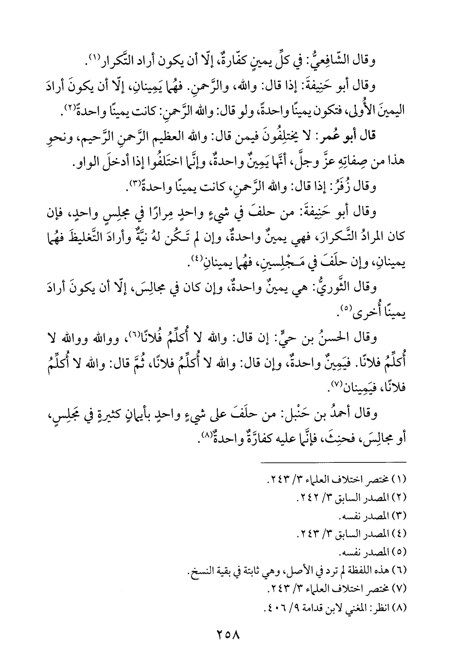 وقال الحسنُ بن حيٍّ: إن قال: واللّه لا أُكلِّمُ فُلانًا (¬٦)، وواللّه وواللّه لا أُكلِّمُ فلانًا. فيَمِينٌ واحدةٌ، وإن قال: واللّه لا أُكلِّمُ فلانًا، ثُمَّ قال: واللّه لا أُكلِّمُ فلانًا، فيَمِينان (¬٧).