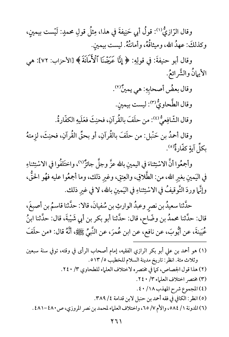 حدَّثنا سعيدُ بن نصرٍ وعبدُ الوارثِ بن سُفيانَ، قالا: حدَّثنا قاسمُ بن أصبغَ، قال: حدَّثنا محمدُ بن وضّاح، قال: حدَّثنا أبو بكر بن أبي شَيْبةَ، قال: حدَّثنا ابنُ عُيَينةَ، عن أيُّوبَ، عن نافع، عن ابن عُمرَ، عن النَّبيِّ -صلى الله عليه وسلم-، أنَّهُ قال: "من حلَفَ