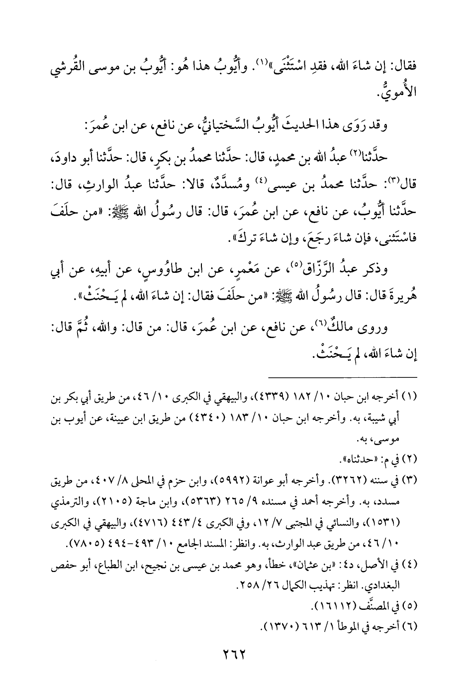 حدَّثنا (¬٢) عبدُ اللّه بن محمدٍ، قال: حدَّثنا محمدُ بن بكرٍ، قال: حدَّثنا أبو داودَ، قال (¬٣): حدَّثنا محمدُ بن عيسى (¬٤) ومُسدَّدٌ، قالا: حدَّثنا عبدُ الوارثِ، قال: حدَّثنا أيُّوبُ، عن نافع، عن ابن عُمرَ، قال: قال رسُولُ اللّه -صلى الله عليه وسلم-: "من حلَفَ فاسْتَثنى، فإن شاءَ رجَعَ، وإن شاءَ تركَ".