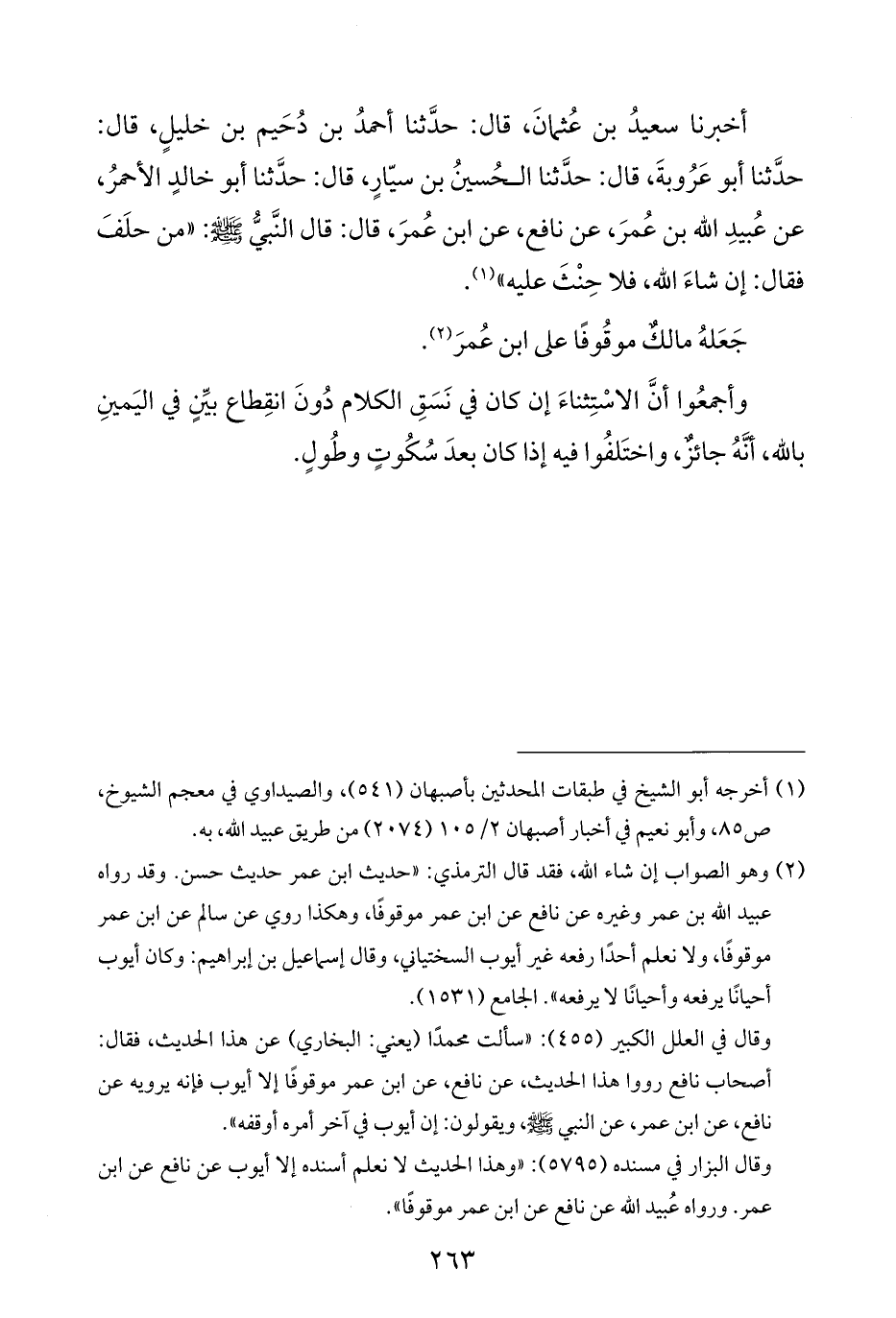 أخبرنا سعيدُ بن عُثمانَ، قال: حدَّثنا أحمدُ بن دُحَيم بن خليلٍ، قال: حدَّثنا أبو عَرُوبةَ، قال: حدَّثنا الحُسينُ بن سيّارٍ، قال: حدَّثنا أبو خالدٍ الأحمرُ، عن عُبيدِ اللّه بن عُمرَ، عن نافع، عن ابن عُمرَ، قال: قال النَّبيُّ -صلى الله عليه وسلم-: "من حلَفَ فقال: إن شاءَ اللّه، فلا حِنْثَ عليه" (¬١).