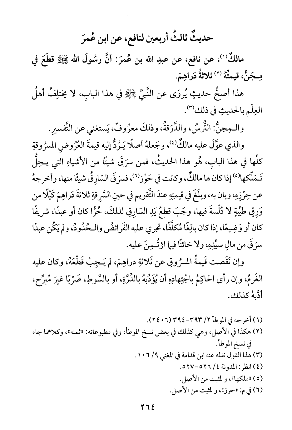 مالكٌ (¬١)، عن نافع، عن عبدِ اللّه بن عُمرَ: أنَّ رسُولَ اللّه -صلى الله عليه وسلم- قطَعَ في مِجَنٍّ، قيمتُهُ (¬٢) ثلاثة دَراهِمَ.