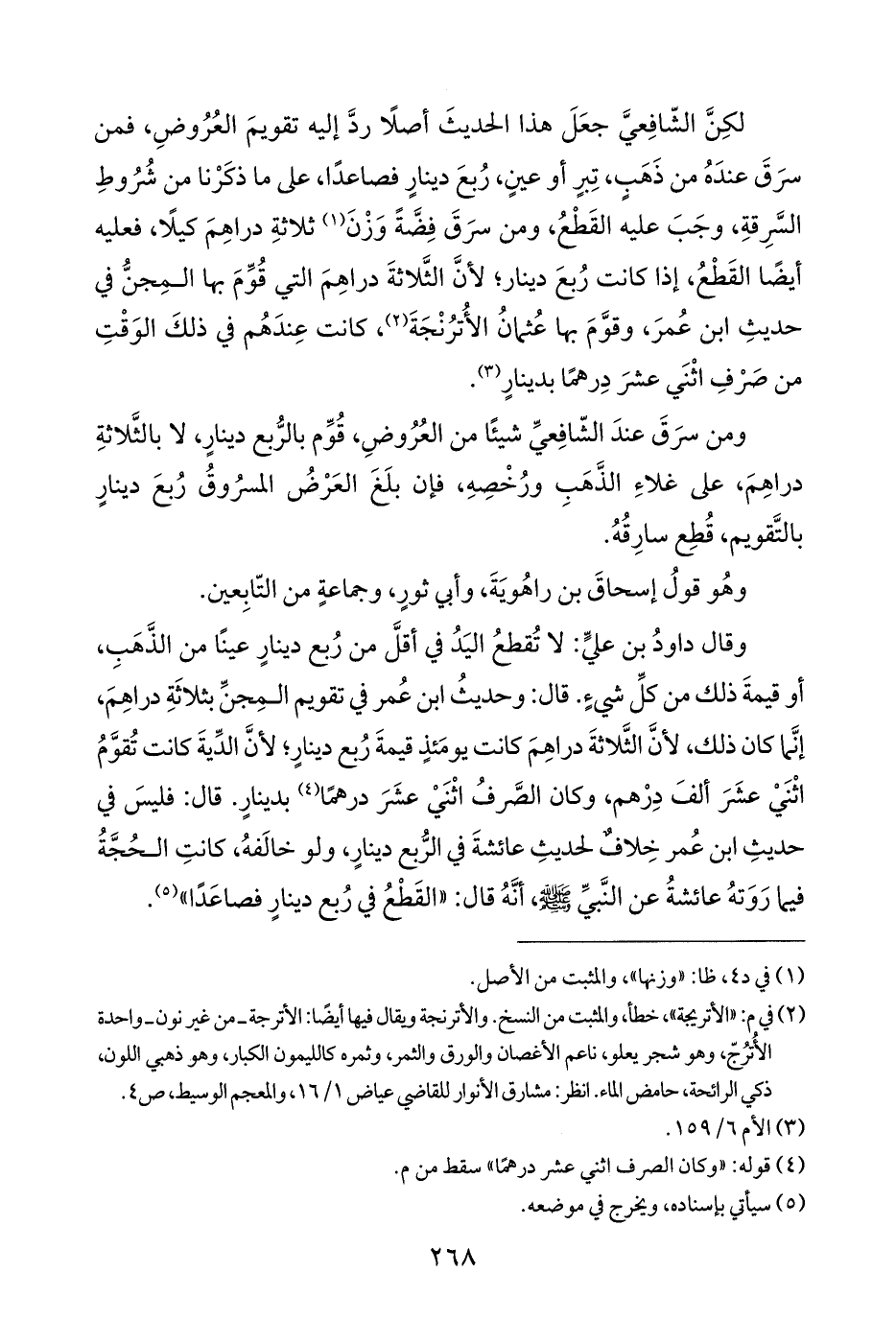لكِنَّ الشّافِعيَّ جحَلَ هذا الحديثَ أصلًا ردَّ إليه تقويمَ العُرُوضِ، فمن سرَقَ عندَهُ من ذَهَبٍ، تِبرٍ أو عينٍ، رُبعَ دينارٍ فصاعدًا، على ما ذكَرْنا من شُرُوطِ السَّرِقةِ، وجَبَ عليه القَطْعُ، ومن سرَقَ فِضَّةً وَزْنَ (¬١) ثلاثةِ دراهِمَ كيلًا، فعليه أيضًا القَطْعُ، إذا كانت رُبعَ دينار؛ لأنَّ الثَّلاثةَ دراهِمَ التي قُوِّمَ بها المِجنُّ في حديثِ ابن عُمرَ، وقوَّمَ بها عُثمانُ الأُترُنْجَةَ (¬٢)، كانت عِندَهُم في ذلكَ الوَقْتِ من صَرْفِ اثْنَي عشرَ دِرهمًا بدينارٍ (¬٣).