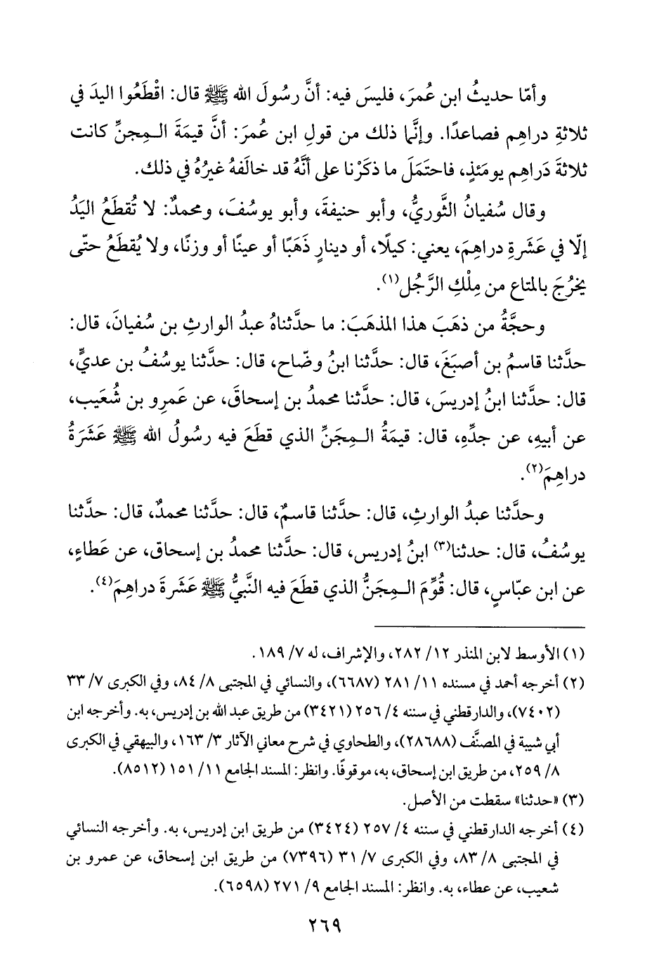وحدَّثنا عبدُ الوارثِ، قال: حدَّثنا قاسمٌ، قال: حدَّثنا محمدٌ، قال: حدَّثنا يوسُفُ، قال: حدثنا (¬٣) ابنُ إدريس، قال: حدَّثنا محمدُ بن إسحاق، عن عَطاءٍ، عن ابن عبّاسٍ، قال: قُوِّمَ المِجَنُّ الذي قطَعَ فيه النَّبيُّ -صلى الله عليه وسلم- عَشَرةَ دراهِمَ (¬٤).