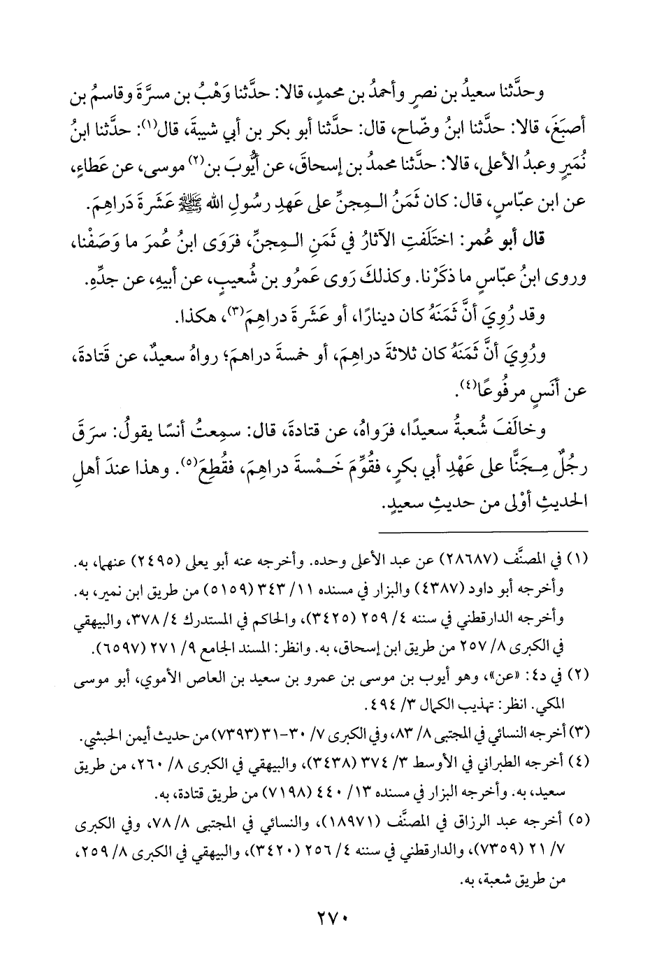 وحدَّثنا سعيدُ بن نصرٍ وأحمدُ بن محمدٍ، قالا: حدَّثنا وَهْبُ بن مسرَّةَ وقاسمُ بن أصبَغَ، قالا: حدَّثنا ابنُ وضّاح، قال: حدَّثنا أبو بكر بن أبي شيبةَ، قال (¬١): حدَّثنا ابنُ نُمَيرٍ وعبدُ الأعلى، قالا: حدَّثنا محمدُ بن إسحاقَ، عن أيُّوبَ بن (¬٢) موسى، عن عَطاءٍ، عن ابن عبّاسٍ، قال: كان ثَمَنُ المِجنِّ على عَهدِ رسُولِ الله -صلى الله عليه وسلم- عَشَرةَ دَراهِمَ.