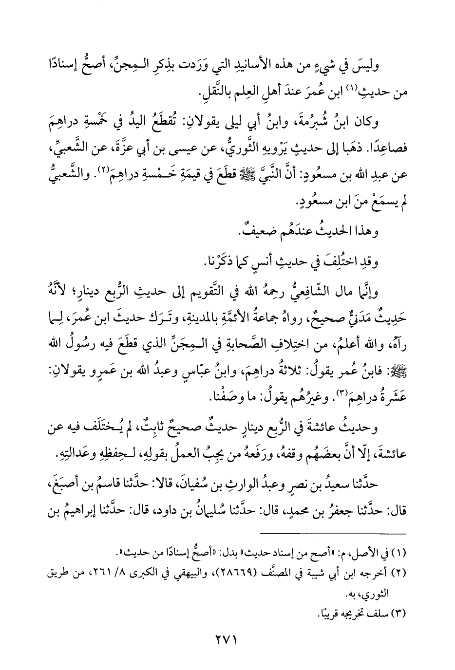 وحديثُ عائشةَ في الرُّبع دينارٍ حديث صحيح ثابِت، لم يُختَلَف فيه عن عائشةَ، إلّا أنَّ بعضَهُم وقفهُ، ورَفَعهُ من يجِبُ العملُ بقولِهِ، لحِفظِهِ وعَدالتِهِ.