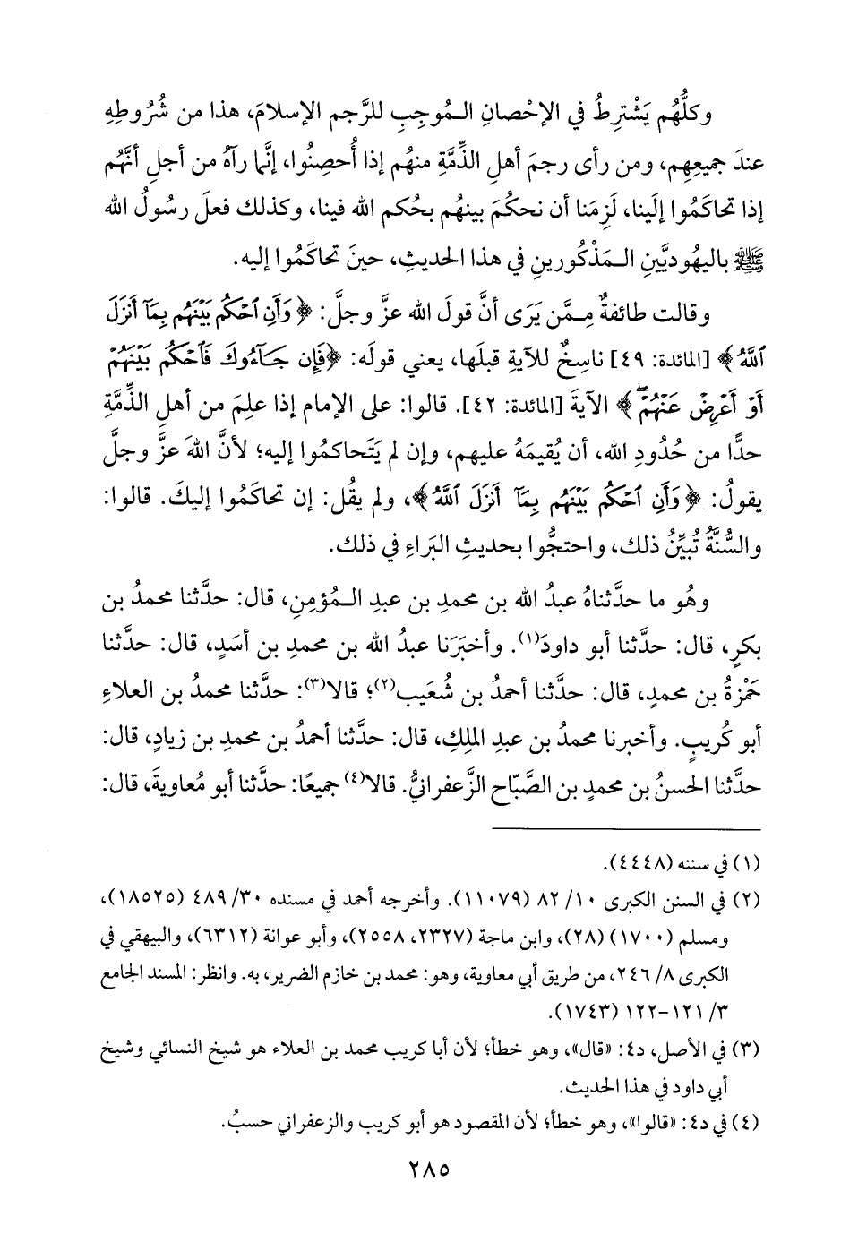 وقالت طائفةٌ مِمَّن يَرَى أنَّ قولَ اللّه عزَّ وجلَّ: {وَأَنِ احْكُمْ بَيْنَهُمْ بِمَا أَنْزَلَ اللَّهُ} [المائدة: ٤٩]، ناسِخٌ للآيةِ قبلَها، يعني قولَه: {فَإِنْ جَاءُوكَ فَاحْكُمْ بَيْنَهُمْ أَوْ أَعْرِضْ عَنْهُمْ} الآيةَ [المائدة: ٤٢]. قالوا: على الإمام إذا علِمَ من أهلِ الذِّمَّةِ حدًّا من حُدُودِ اللّه، أن يُقيمَهُ عليهم، وإن لم يَتَحاكمُوا إليه؛ لأنَّ اللّهَ عزَّ وجلَّ يقولُ: {وَأَنِ احْكُمْ بَيْنَهُمْ بِمَا أَنْزَلَ اللَّهُ}، ولم يقُل: إن تحاكَمُوا إليكَ. قالوا: والسُّنّة تُبيِّنُ ذلك، واحتجُّوا بحديثِ البَراءِ في ذلك.