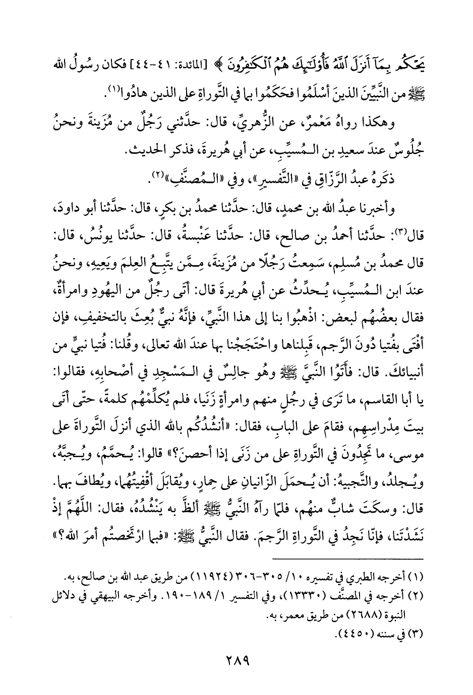 وأخبرنا عبدُ اللّه بن محمدٍ، قال: حدَّثنا محمدُ بن بكرٍ، قال: حدَّثنا أبو داودَ، قال (¬٣): حدَّثنا أحمدُ بن صالح، قال: حدَّثنا عَنْبسةُ، قال: حدَّثنا يونُسُ، قال: قال محمدُ بن مُسلِم، سَمِعتُ رَجُلًا من مُزَينةَ، مِمَّن يتَّبِعُ العِلمَ ويَعِيهِ، ونحنُ عندَ ابن المُسيِّبِ، يُحدِّثُ عن أبي هُريرةَ قال: أتَى رجُلٌ من اليهُودِ وامرأةٌ، فقال بعضُهُم لبعض: اذْهبُوا بنا إلى هذا النَّبيِّ، فإنَّهُ نبيٌّ بُعِثَ بالتخفيفِ، فإن أفْتَى بفُتيا دُونَ الرَّجم، قَبِلناها واحْتَجَجْنا بها عندَ اللّه تعالى، وقُلنا: فُتيا نبيٍّ من أنبيائكَ. قال: فأَتَوُا النَّبيَّ -صلى الله عليه وسلم- وهُو جالِسٌ في المَسْجِدِ في أصْحابِهِ، فقالوا: يا أبا القاسم، ما تَرَى في رجُلٍ منهم وامرأةٍ زَنَيا، فلم يُكلِّمْهُم كلمةً، حتّى أَتَى بيتَ مِدْراسِهِم، فقامَ على البابِ، فقال: "أنشُدُكُم باللّه الذي أنزلَ التَّوراةَ على موسى، ما تَجِدُونَ في التَّوراةِ على من زَنَى إذا أحصنَ؟ " قالوا: يُحمَّمُ، ويُجبَّهُ، ويُجلدُ، والتَّجبيهُ: أن يُحمَلَ الزّانيانِ على حِمارٍ، ويُقابَلَ أقْفِيتُهُما، ويُطافَ بهما. قال: وسكَتَ شابٌّ منهُم، فلمّا رآهُ النَّبيُّ -صلى الله عليه وسلم- ألظَّ به يَنْشُدُهُ، فقال: اللَّهُمَّ إذْ نَشَدْتَنا، فإنّا نَجِدُ في التَّوراةِ الرَّجمَ. فقال النَّبيُّ -صلى الله عليه وسلم-: "فبما ارْتَخصتُم أمرَ اللّه؟ "