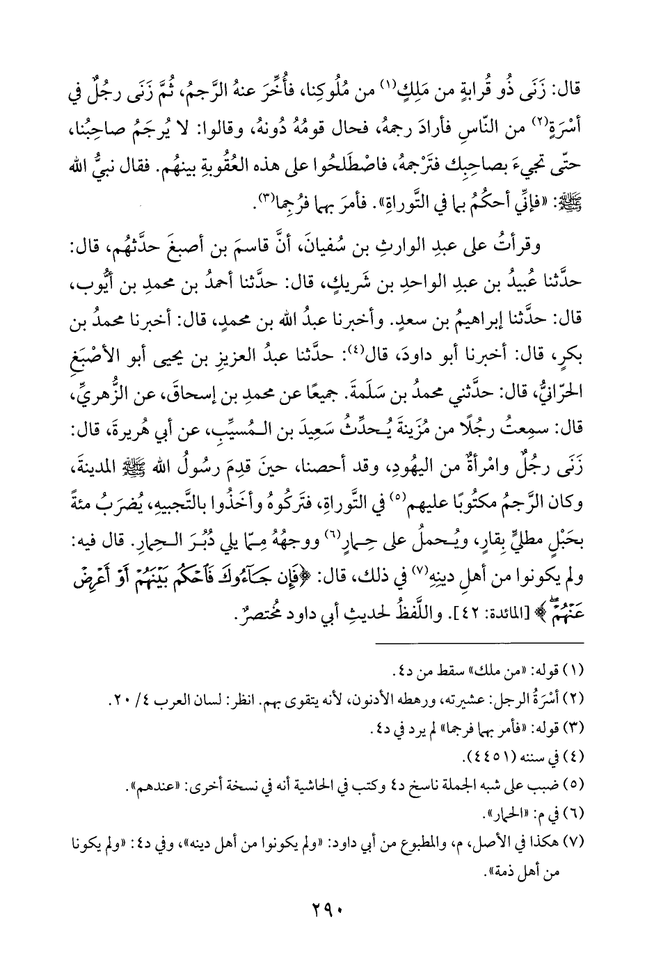 وقرأتُ على عبدِ الوارثِ بن سُفيانَ، أنَّ قاسمَ بن أصبغَ حدَّثهُم، قال: حدَّثنا عُبيدُ بن عبدِ الواحدِ بن شَريكٍ، قال: حدَّثنا أحمدُ بن محمدِ بن أيُّوبُ، قال: حدَّثنا إبراهيمُ بن سعدٍ. وأخبرنا عبدُ اللّه بن محمدٍ، قال: أخبرنا محمدُ بن بكرٍ، قال: أخبرنا أبو داودَ، قال (¬٤): حدَّثنا عبدُ العزيزِ بن يحيى أبو الأصْبَغِ الحرّانيُّ، قال: حدَّثني محمدُ بن سَلَمةَ. جميعًا عن محمدِ بن إسحاقَ، عن الزُّهريِّ، قال: سمِعتُ رجُلًا من مُزَينةَ يُحدِّثُ سَعِيدَ بن المُسيِّبِ، عن أبي هُريرةَ، قال: زَنَى رجُلٌ وامْرأةٌ من اليهُودِ، وقد أحصنا، حينَ قدِمَ رسُولُ اللّه -صلى الله عليه وسلم- المدينةَ، وكان الرَّجمُ مكتُوبًا عليهم (¬٥) في التَّوراةِ، فتَركُوهُ وأخَذُوا بالتَّجبيهِ، يُضرَبُ مئةً بحَبْلٍ مطليٍّ بِقارٍ، ويُحملُ على حِمارٍ (¬٦) ووجهُهُ مِمّا يلي دُبُرَ الحِمارِ. قال فيه: ولم يكونوا من أهلِ دينِهِ (¬٧) في ذلك، قال: {فَإِنْ جَاءُوكَ فَاحْكُمْ بَيْنَهُمْ أَوْ أَعْرِضْ عَنْهُمْ} [المائدة: ٤٢]. واللَّفظُ لحديثِ أبي داود مخُتصرٌ.