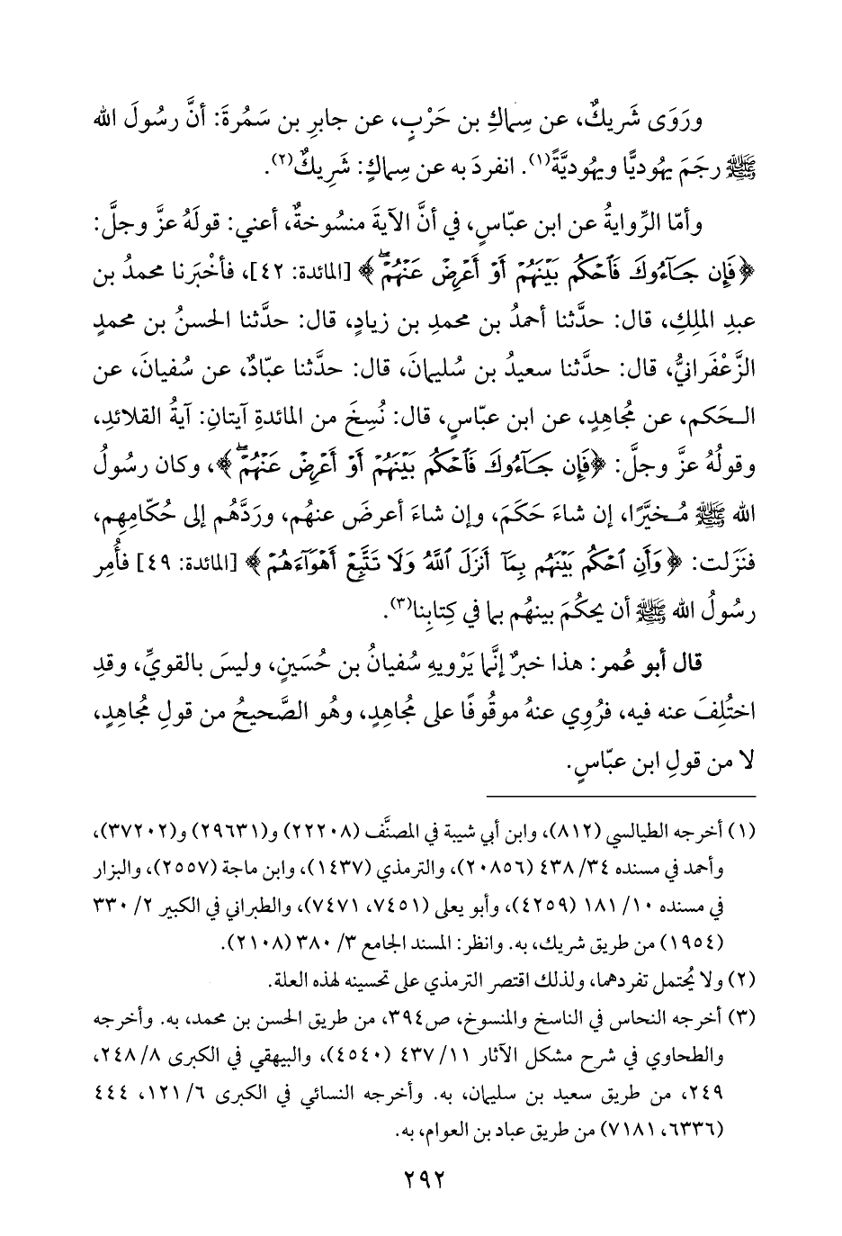 وأمّا الرِّوايةُ عن ابن عبّاسٍ، في أنَّ الآيةَ منسُوخةٌ، أعني: قولَهُ عزَّ وجلَّ: {فَإِنْ جَاءُوكَ فَاحْكُمْ بَيْنَهُمْ أَوْ أَعْرِضْ عَنْهُمْ} [المائدة: ٤٢]، فأخْبَرنا محمدُ بن عبدِ الملِكِ، قال: حدَّثنا أحمدُ بن محمدِ بن زيادٍ، قال: حدَّثنا الحسنُ بن محمدٍ الزَّعْفَرانيُّ، قال: حدَّثنا سعيدُ بن سُليمانَ، قال: حدَّثنا عبّادٌ، عن سُفيانَ، عن الحَكم، عن مجُاهِدٍ، عن ابن عبّاسٍ، قال: نُسِخَ من المائدةِ آيتانِ: آيةُ القلائدِ، وقولُهُ عزَّ وجلَّ: {فَإِنْ جَاءُوكَ فَاحْكُمْ بَيْنَهُمْ أَوْ أَعْرِضْ عَنْهُمْ}، وكان رسُولُ اللّه -صلى الله عليه وسلم- مُخيَّرًا، إن شاءَ حَكَمَ، وإن شاءَ أعرضَ عنهُم، ورَدَّهُم إلى حُكّامِهِم، فنَزَلت: {وَأَنِ احْكُمْ بَيْنَهُمْ بِمَا أَنْزَلَ اللَّهُ وَلَا تَتَّبِعْ أَهْوَاءَهُمْ} [المائدة: ٤٩]، فأُمِر رسُولُ اللّه -صلى الله عليه وسلم- أن يحكُمَ بينهُم بما في كِتابِنا (¬٣).
