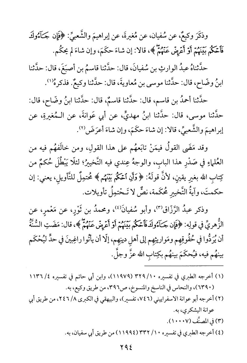 وذكر عبدُ الرَّزّاق (¬٣)، وأبو سُفيانَ (¬٤)، ومحمدُ بن ثَوْرٍ، عن مَعْمرٍ، عن الزُّهريِّ في قولِه: {فَإِنْ جَاءُوكَ فَاحْكُمْ بَيْنَهُمْ أَوْ أَعْرِضْ عَنْهُمْ}، قال: مَضَتِ السُّنَّةُ أن يُرَدُّوا في حُقُوقِهِم ومَواريثِهِم إلى أهلِ دينِهِم، إلّا أن يأتُوا راغِبينَ في حدٍّ ليُحْكَم بينهُم فيه، فيُحكَمَ بينهُم بكِتابِ الله عزَّ وجلَّ.