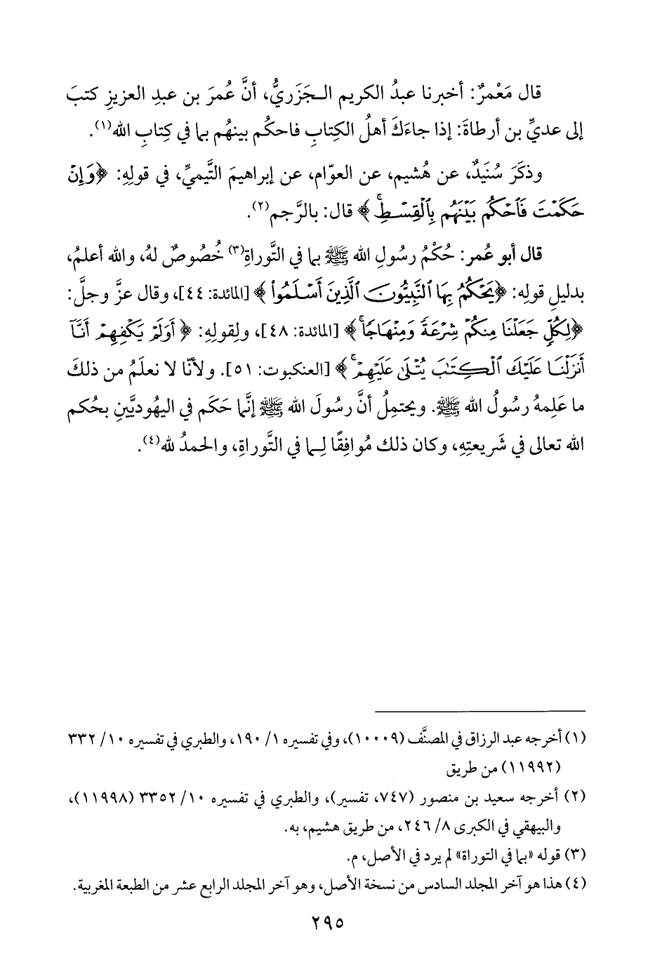 وذكَرَ سُنَيدٌ، عن هُشيم، عن العوّام، عن إبراهيمَ التَّيميِّ، في قولِهِ: {وَإِنْ حَكَمْتَ فَاحْكُمْ بَيْنَهُمْ بِالْقِسْطِ} قال: بالرَّجم (¬٢).