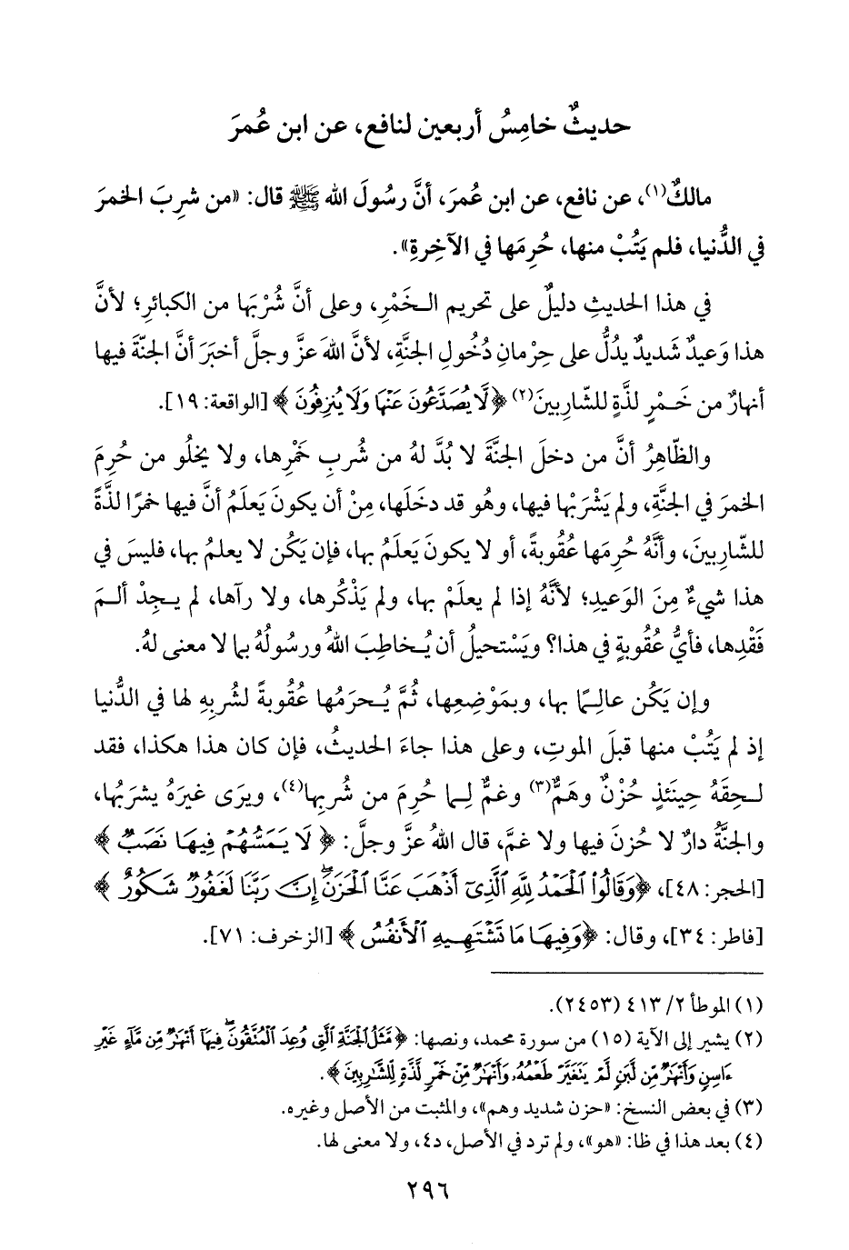 والظّاهِرُ أنَّ من دخلَ الجنّةَ لا بُدَّ لهُ من شُربِ خَمْرِها، ولا يخلُو من حُرِمَ الخمرَ في الجنَّةِ، ولم يَشْرَبْها فيها، وهُو قد دخَلَها، مِنْ أن يكونَ يَعلَمُ أنَّ فيها خمرًا لذَّةً للشّارِبينَ، وأنَّهُ حُرِمَها عُقُوبةً، أو لا يكونَ يَعلَمُ بها، فإن يَكُن لا يعلمُ بها، فليسَ في هذا شيءٌ مِنَ الوَعيدِ؛ لأنَّهُ إذا لم يعلَمْ بها، ولم يَذْكُرها، ولا رآها، لم يجِدْ ألمَ فَقْدِها، فأيُّ عُقُوبةٍ في هذا؟ وَيسْتحيلُ أن يُخاطِبَ اللهُ ورسُولُهُ بما لا معنى لهُ.