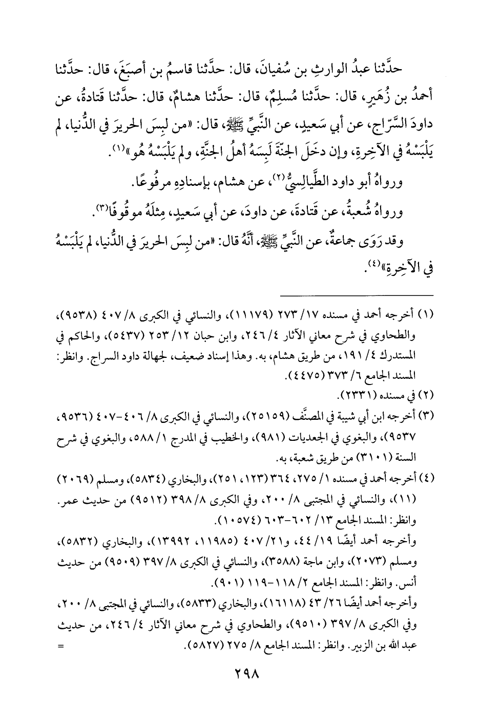 حدَّثنا عبدُ الوارثِ بن سُفيانَ، قال: حدَّثنا قاسمُ بن أصبَغَ، قال: حدَّثنا أحمدُ بن زُهَيرٍ، قال: حدَّثنا مُسلِمٌ، قال: حدَّثنا هشامٌ، قال: حدَّثنا قَتادةُ، عن داودَ السَّرّاج، عن أبي سَعيدٍ، عن النَّبيِّ -صلى الله عليه وسلم-، قال: "من لبِسَ الحريرَ في الدُّنيا، لم يَلْبَسْهُ في الآخِرةِ، وإن دخَلَ الجنّةَ لَبِسَهُ أهلُ الجنَّةِ، ولم يَلْبَسْهُ هُو" (¬١).