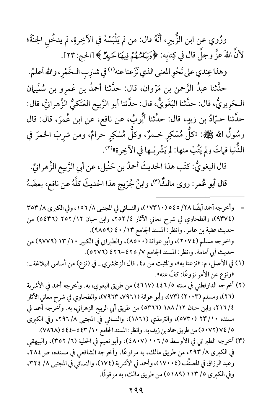 وهذا عِندي على نَحْوِ المعنى الذي نَزَعنا عنه (¬١) في شارِبِ الخَمْرِ، والله أعلمُ. حدَّثنا عبدُ الرَّحمن بن مَرْوان، قال: حدَّثنا أحمدُ بن عَمرِو بن سُلَيمان الحَرِيريُّ، قال: حدَّثنا البَغَويُّ، قال: حدَّثنا أبو الرَّبيع العَتكيُّ الزَّهرانيُّ، قال: حدَّثنا حمّادُ بن زيدٍ، قال: حدَّثنا أيُّوبُ، عن نافع، عن ابن عُمرَ، قال: قال رسُولُ الله -صلى الله عليه وسلم-: "كلُّ مُسْكِرٍ خمرٌ، وكلُّ مُسْكِرٍ حرامٌ، ومن شرِبَ الخمرَ في الدُّنيا فماتَ ولم يَتُبْ منها: لم يَشْربْها في الآخِرة" (¬٢).